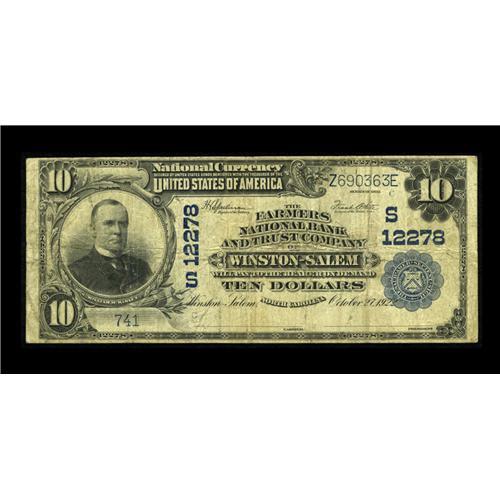 <B>Winston-Salem, NC</B></I> - $10 1902 Plain Back Fr. 635 <B>The Farmers NB & TC</B></I> Ch. # (S)12278<BR>Although the signatures have faded, there is really nothing else to quibble about with this nicely centered middle grade note. <B>Fine</B></I><BR><BR><b>Shipping:</b> Coin/Currency (<a target="_blank" href="http://www.heritageauctions.com/common/shipping.php">view shipping information</a>)