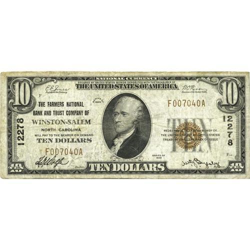 <B>Winston-Salem, NC</B></I> - $10 1929 Ty. 1 <B>The Farmers NB & TC</B></I> Ch. # 12278<BR>Chartered in 1922 and shut down in 1934, this bank issued only the Plain Backs and 1929 series. This <B>Fine+</B></I> is actually the highest serial listed in the census from here and should sell in the range of...