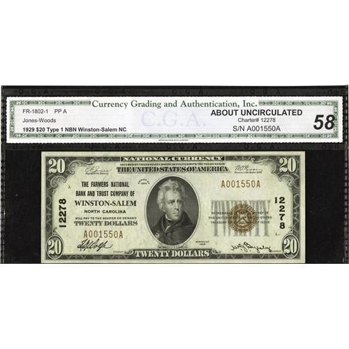 <B>Winston-Salem, NC</B></I> - $20 1929 Ty. 1 <B>The Farmers NB & TC</B></I> Ch. # 12278<BR>This bright white example did not pass through many tobacco farmer's hands in its day. Graded <B>About Uncirculated 58</B></I> by CGA.