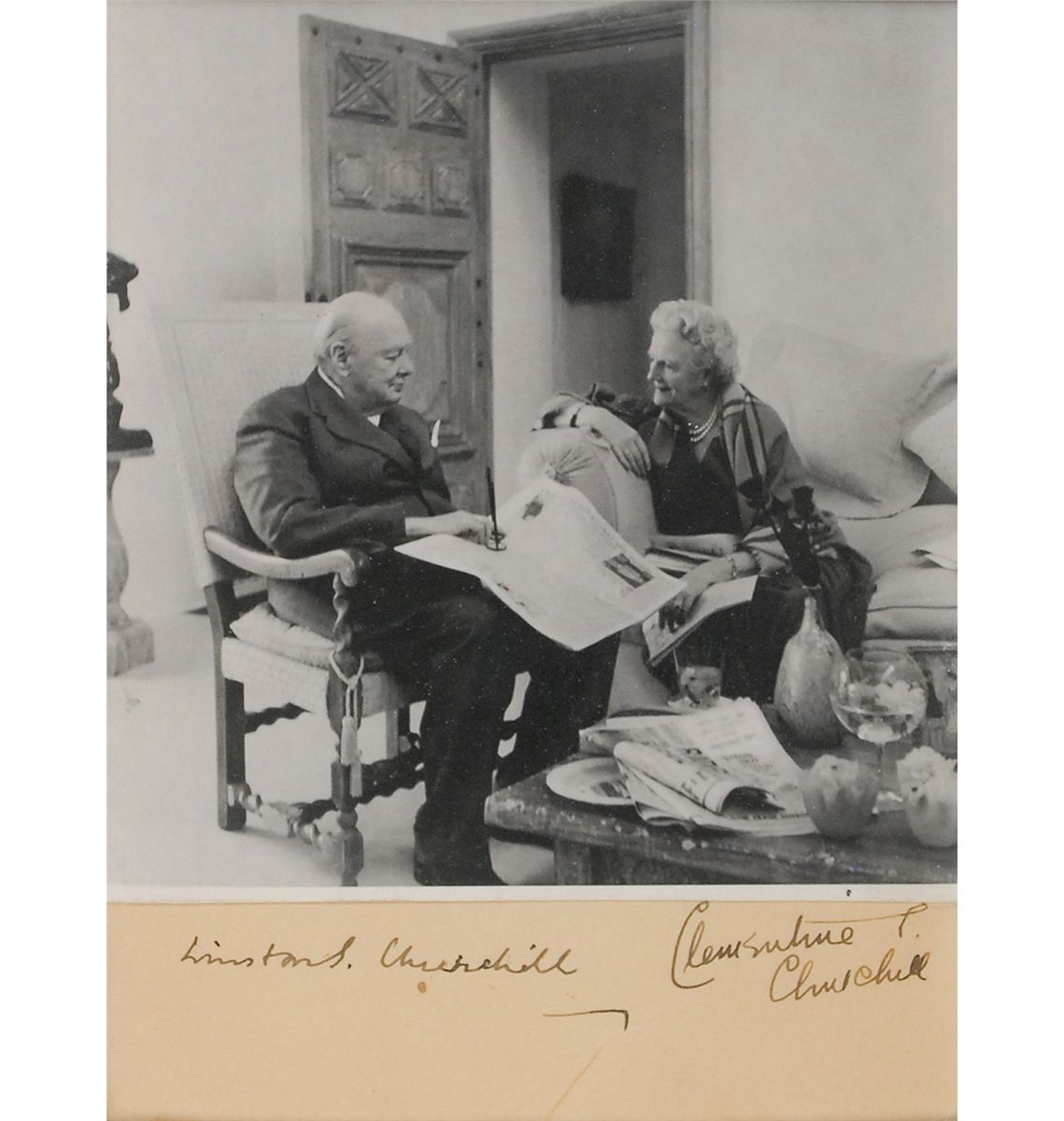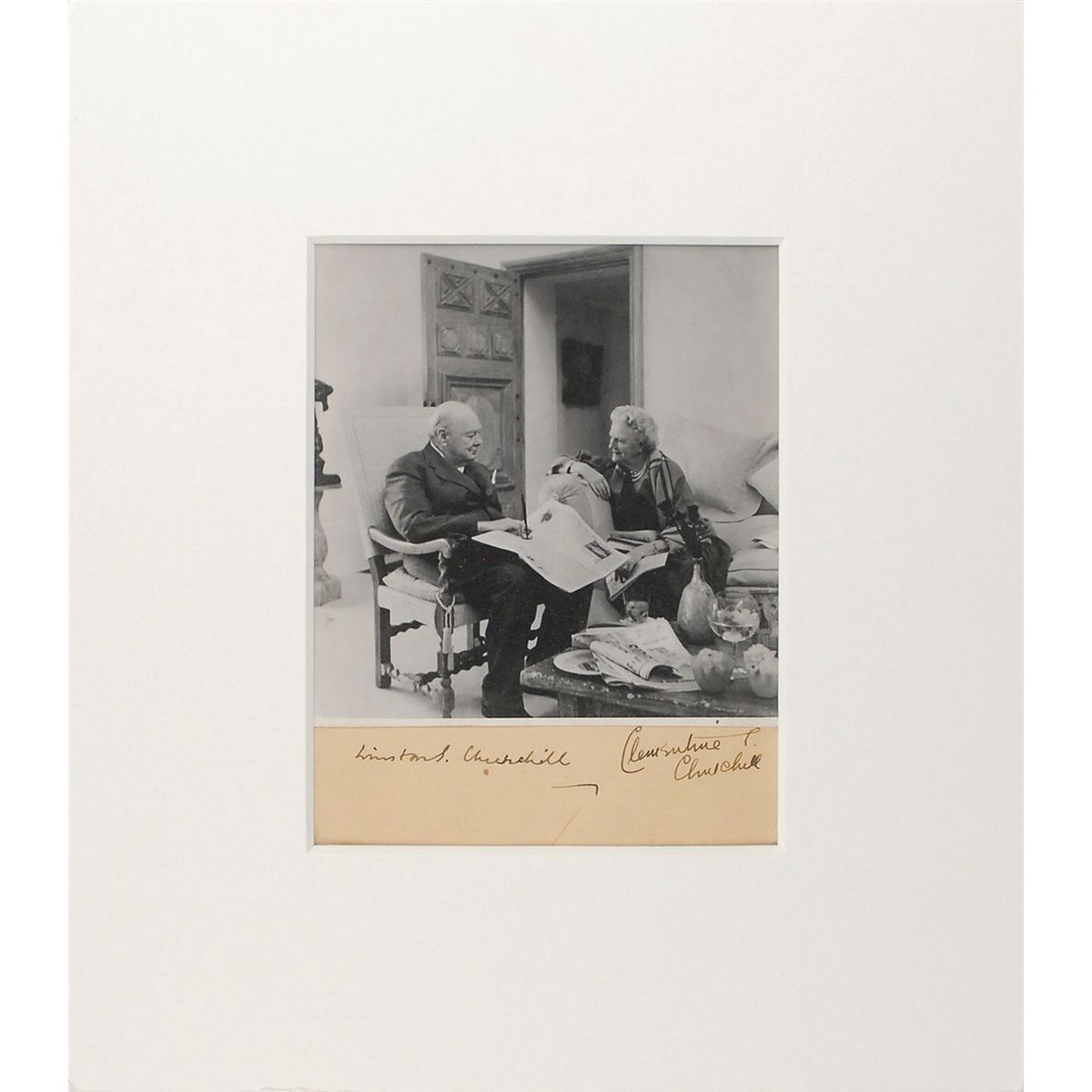 Vintage matte-finish 6 x 6.25 photo of the Churchills seated in a drawing room and reading the newspaper together, affixed to a 6 x 8 mount, signed on the mount in fountain pen, “Winston S. Churchill” and “Clementine S. Churchill.” Matted to an overall size of 12.5 x 14. In fine condition. Single items signed by both Churchills are incredibly scarce—the uncommon combination of signatures and charming image of the intellectual couple later in their lives make this a highly desirable photo.