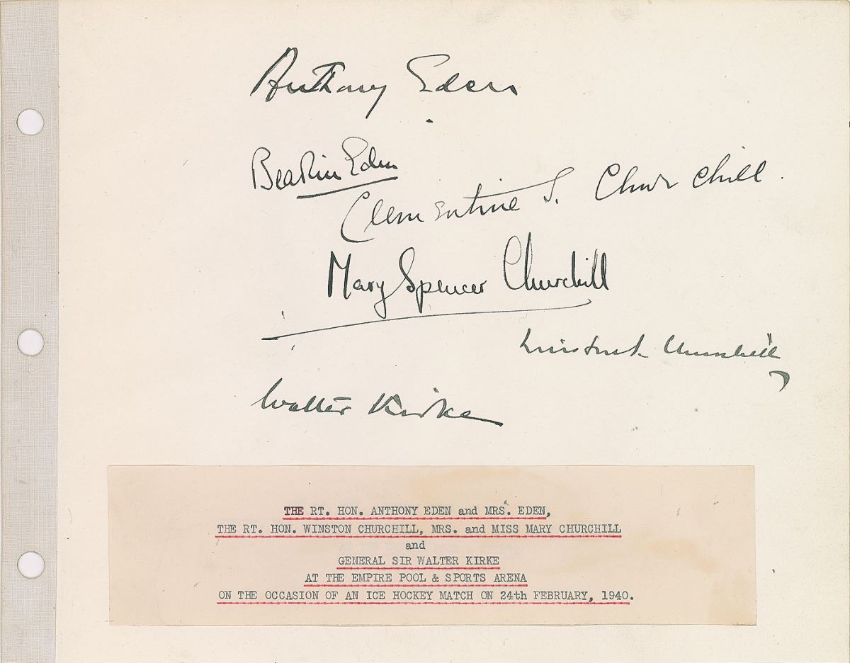 Ink signatures, "Winston S. Churchill" and "Clementine S. Churchill," on an off-white 10.5 x 8.25 guest book page. Also signed by former Prime Minister Anthony Eden and his first wife Beatrice Beckett, Mary Spencer-Churchill (the youngest Churchill child), and Walter Kirke, the Commander in Chief of the British Home Forces during the Second World War. Lower portion bears an affixed caption indicating that the signatures were obtained at the Empire Pool and Sports Arena on the occasion of an ice hockey match on February 24, 1940. In fine condition. Pre-certified PSA/DNA.
