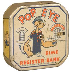 Popeye Dime Register Bank. Locks with the first dime and then unlocks when it reaches $5. A few scuffs, mostly around edges otherwise good condition.