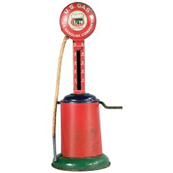 Tin Gas Pump Toy. Cranks up to full. Some rust mostly on back side otherwise good condition. 7 1/4 inches tall. Start Price $40