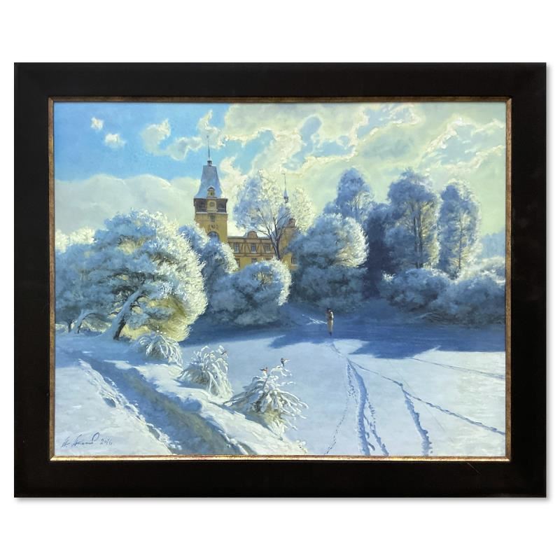 "Winter Chateau" is a limited edition giclee on canvas by Alexander Akopov, numbered 12/95 inverso and hand signed. This piece comes matted. Includes Letter of Authenticity. Measures approx. 25.5" x 31.5" (matting), 21" x 27" (image).