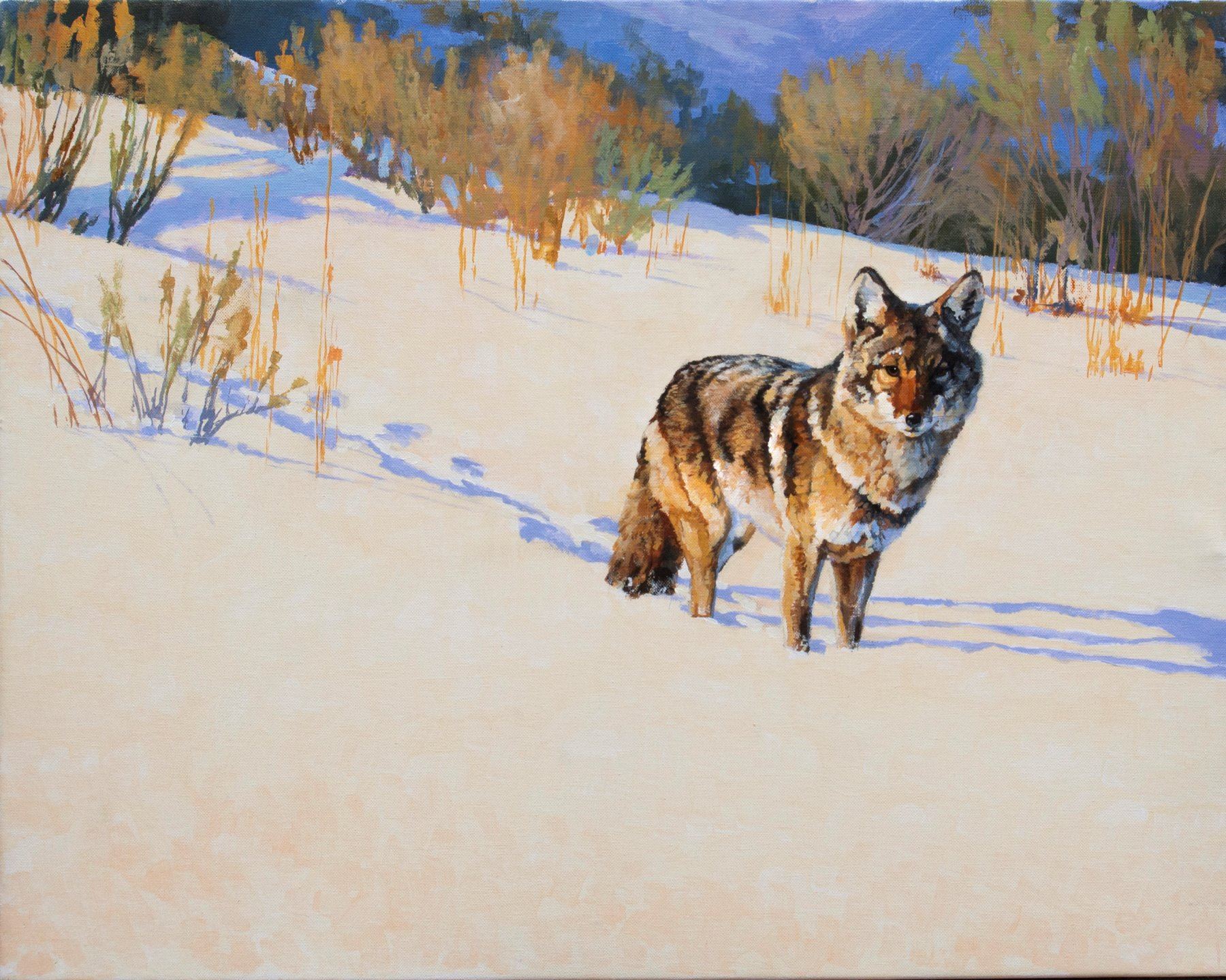 Artist: Edward DuRose. Title: Winter Coyote. Artwork size: 20" x 30". Frame: unframed gallery wrap. Medium: Acrylic/Canvas. Artist's description: I wanted to capture the starkness of the winter landscape on a sunny day. The interplay of the warm colors of the sunlight on the snow and the vegetation with the cool blues of the shadows in the snow was a fun challenge.