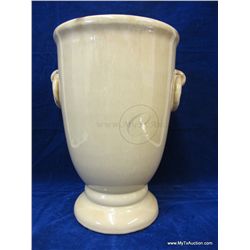 This earthenware pot is shaped like and urn with molded handles on each side. Done in a high gloss yellow/beige finish, with an aged drip appearance a