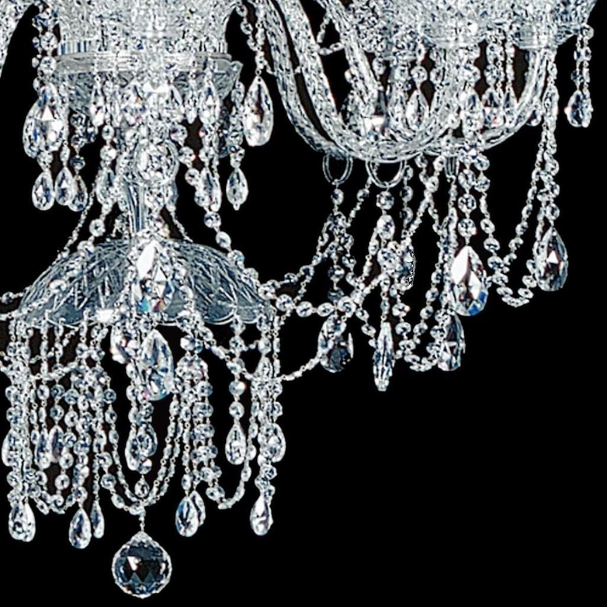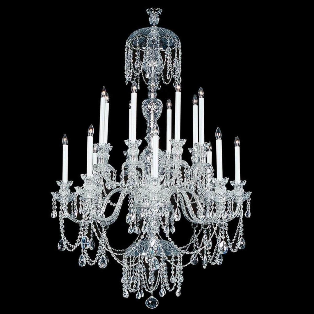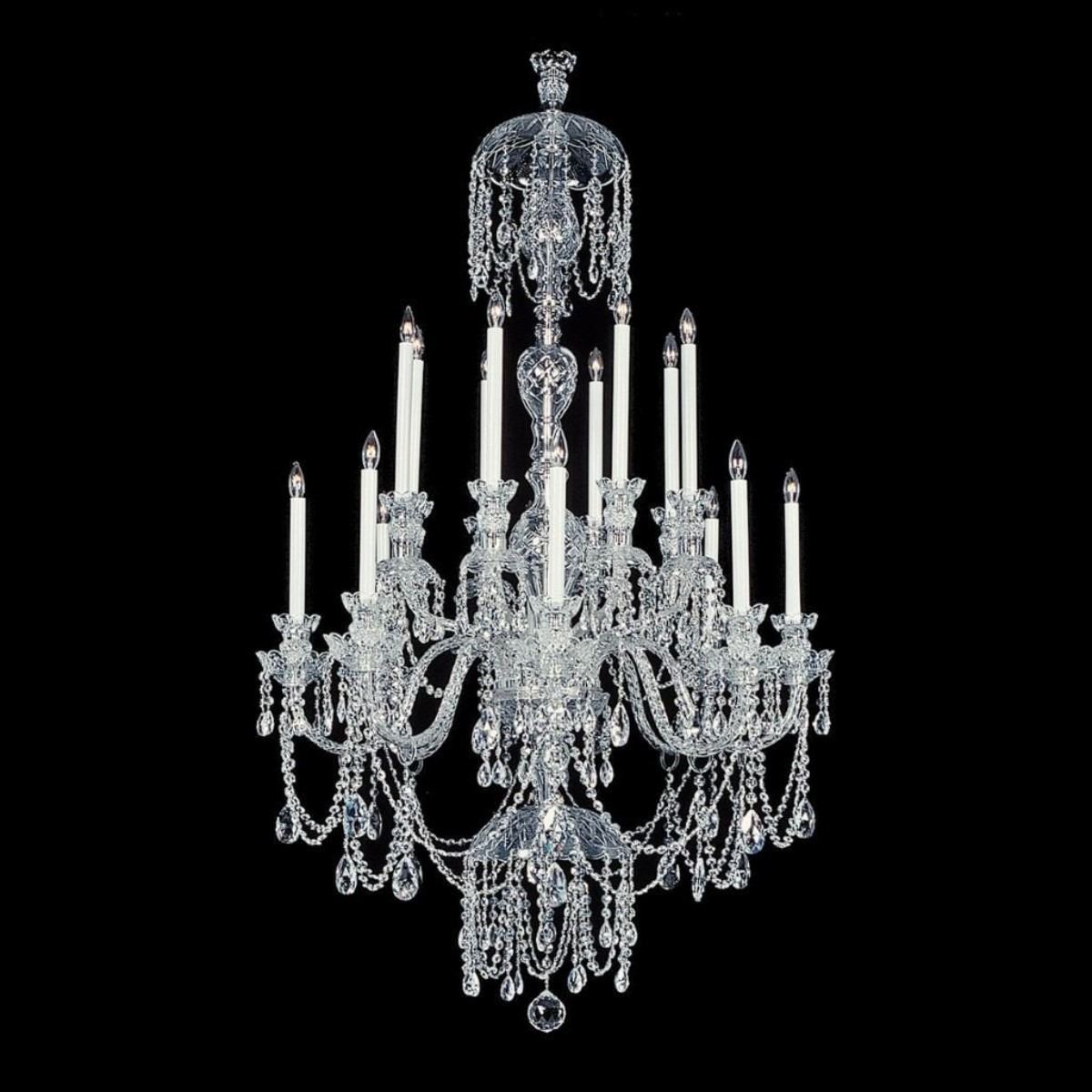 This is a fabulous foyer piece, but if your ceilings are tall enough, use it anywhere. It is embellished with 3 sets of arm to arm festoons - each set accented with a large, 2.5" almond. Crystal swagging on the top and bottom bobeches offer harmony and are punctuated with Signature 3-button almonds. These same 3-button almonds trim the bobeches of the arms. Quick Look: 36" wide x 63" long 16 lights (8 lower, 8 upper) Candelabra base, 40 watt max per socket. Chain and mounting hardware included. Assembled in US of imported and domestic components. UL Dry Location Shown in Polished Nickel 95 lbs