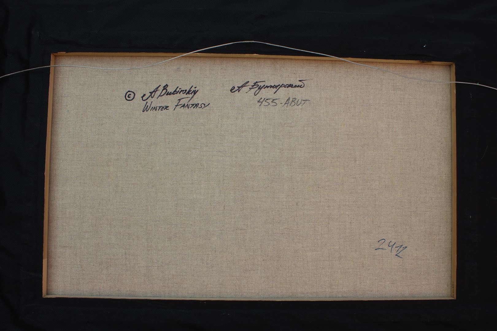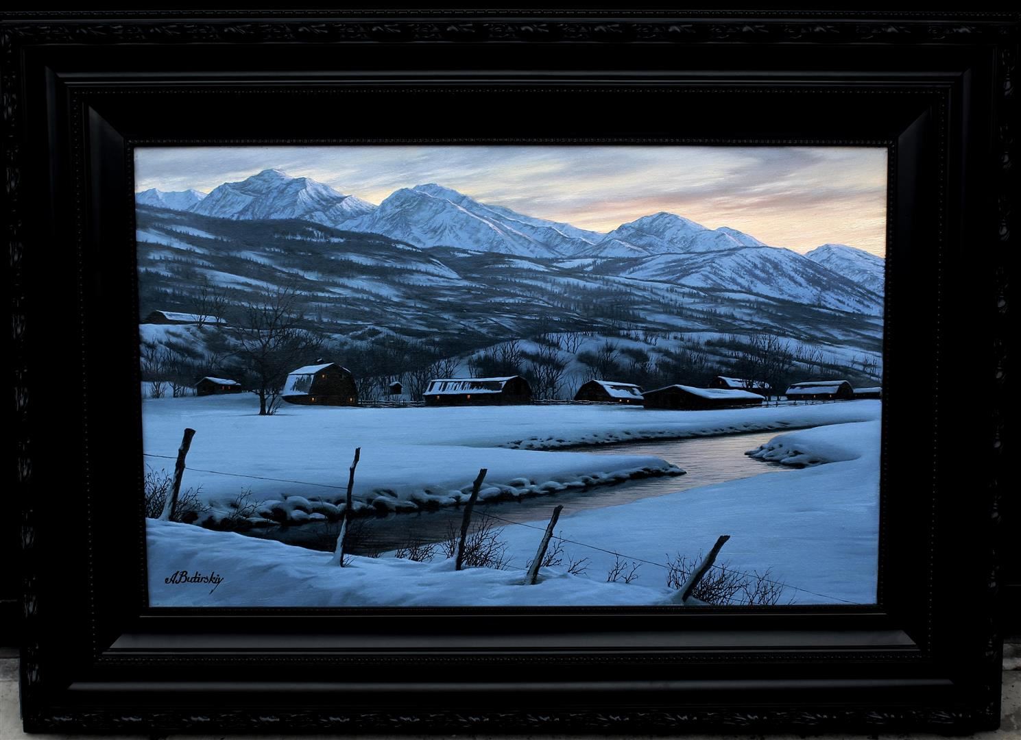 The iconic magnificence of the Sierra Mountains is displayed in this peaceful, rural winter scene, with cabins overlooking a small river. The twice-signed oil on linen measures 19.625 x 31.5; framed image measures approx. 31.625 x 43.5.