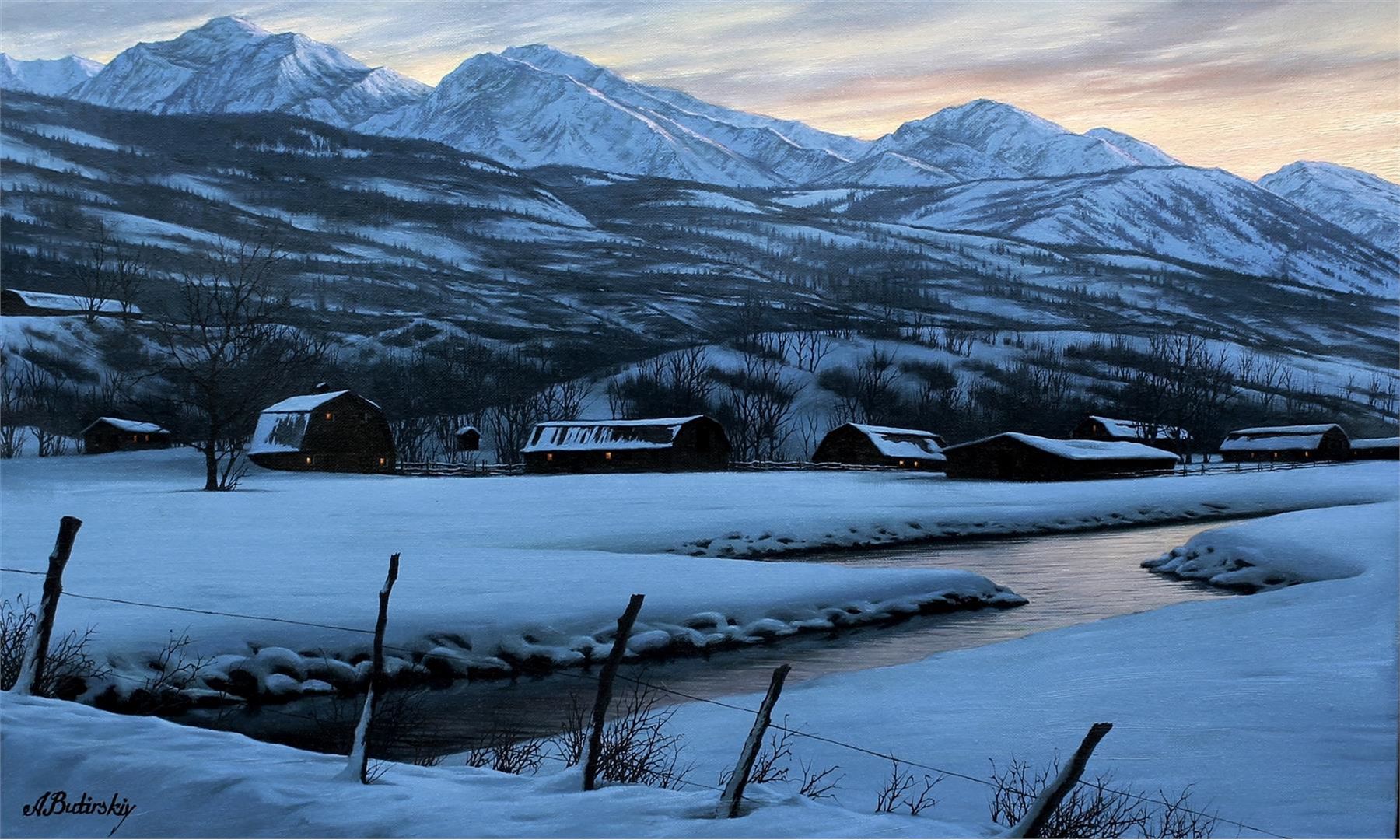 The iconic magnificence of the Sierra Mountains is displayed in this peaceful, rural winter scene, with cabins overlooking a small river. The twice-signed oil on linen measures 19.625 x 31.5; framed image measures approx. 31.625 x 43.5.