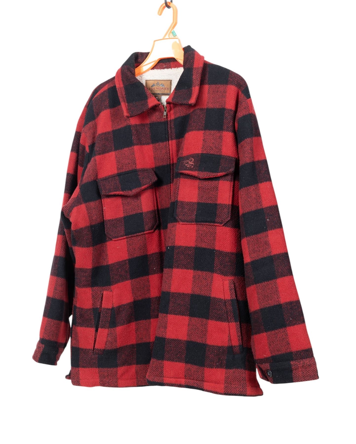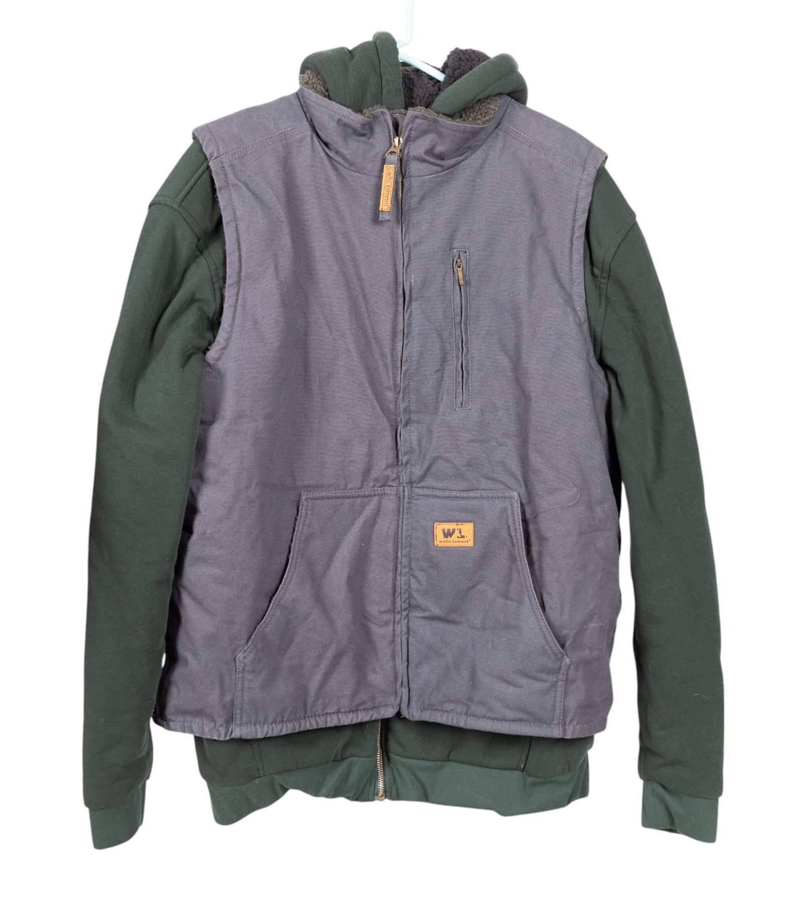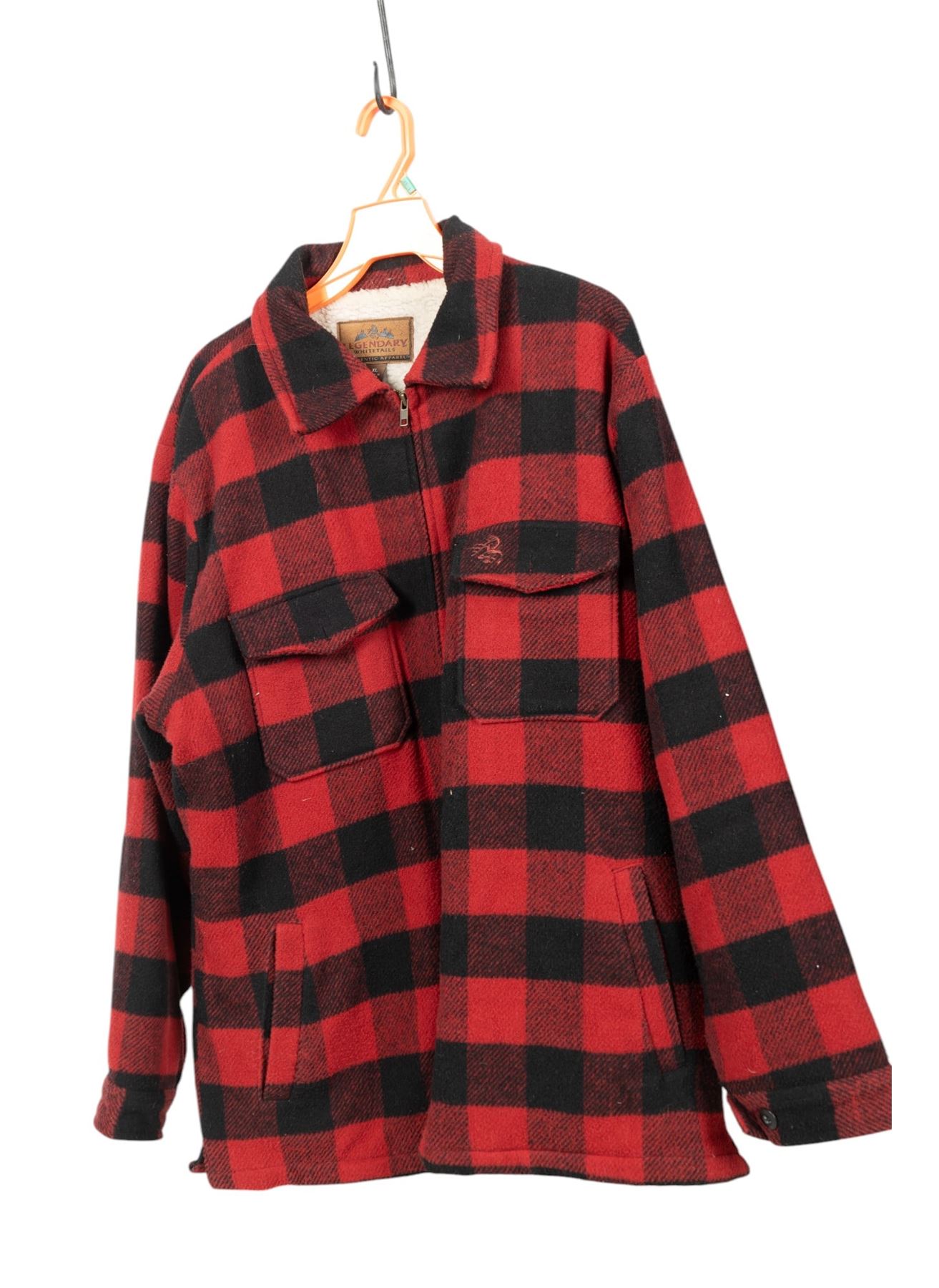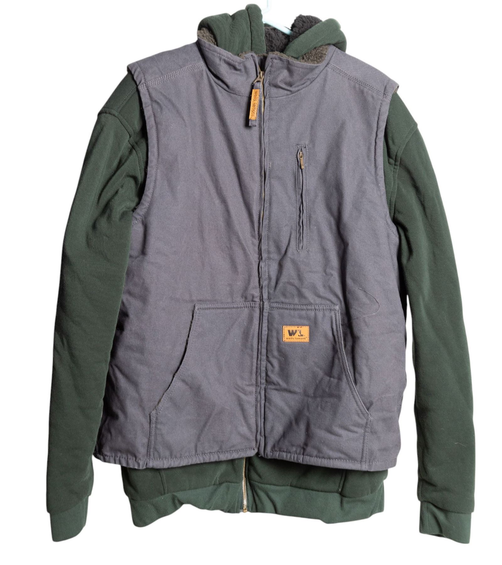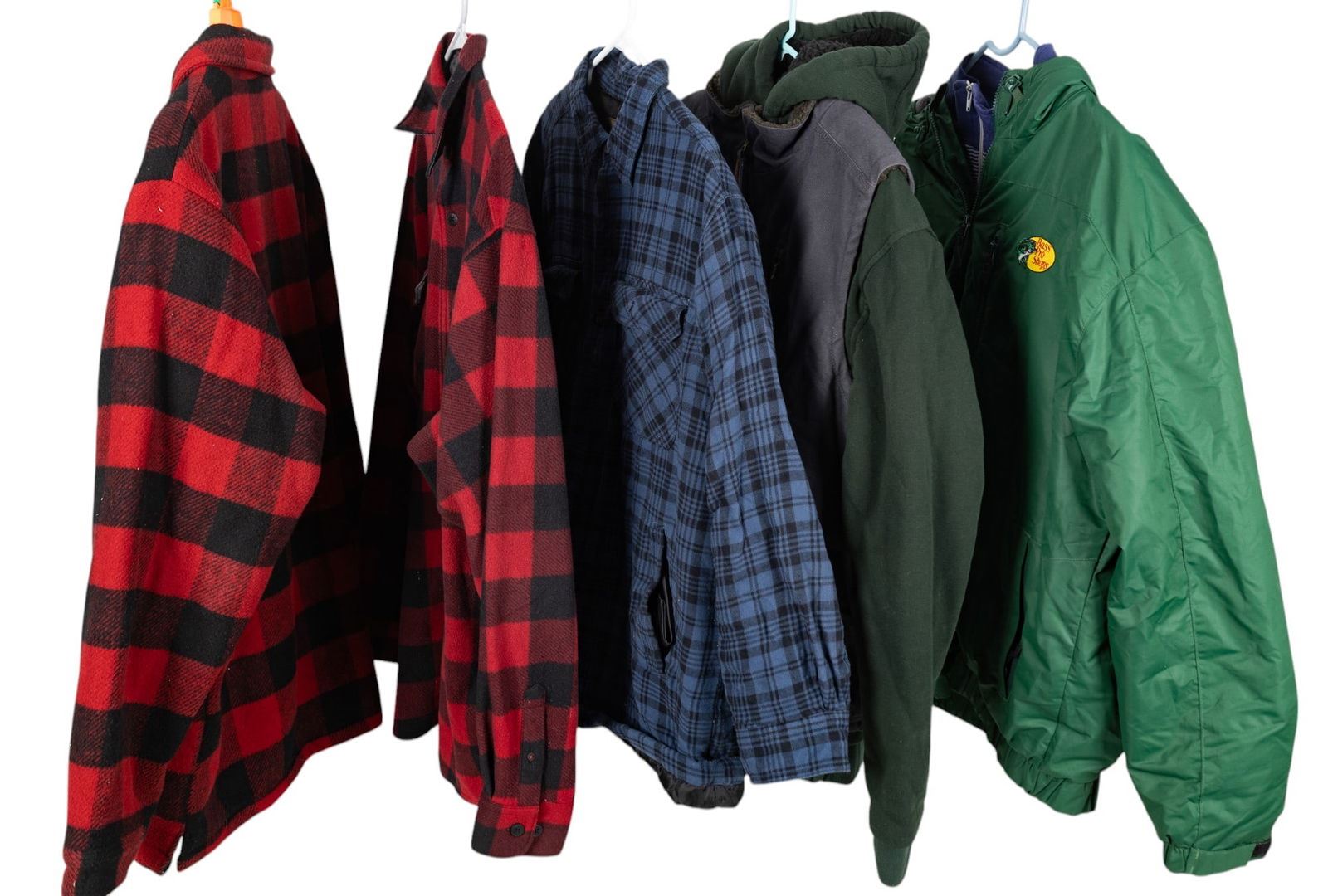 Bass Pro Shop fleece lined parka, sherpa lined zip up hoodie from Architect Jean Co, sherpa lined canvas vest from Wells Lamont, insulated flannel from Northwest Territory, buffalo plaid fleece jacket by Wrangler, buffalo plaid sherpa lined jacket from Legendary Whitetails, and a blue and grey striped zip up jacket by Apparatus. Good for hunting.