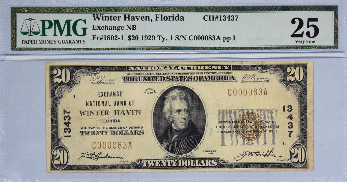 Winter Haven, Florida. Exchange NB. Fr. 1802-1. 1929 $20 Type I. Charter 13437. PMG Very Fine 25.