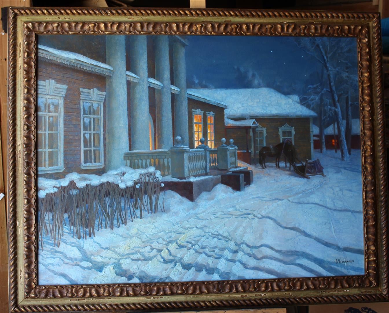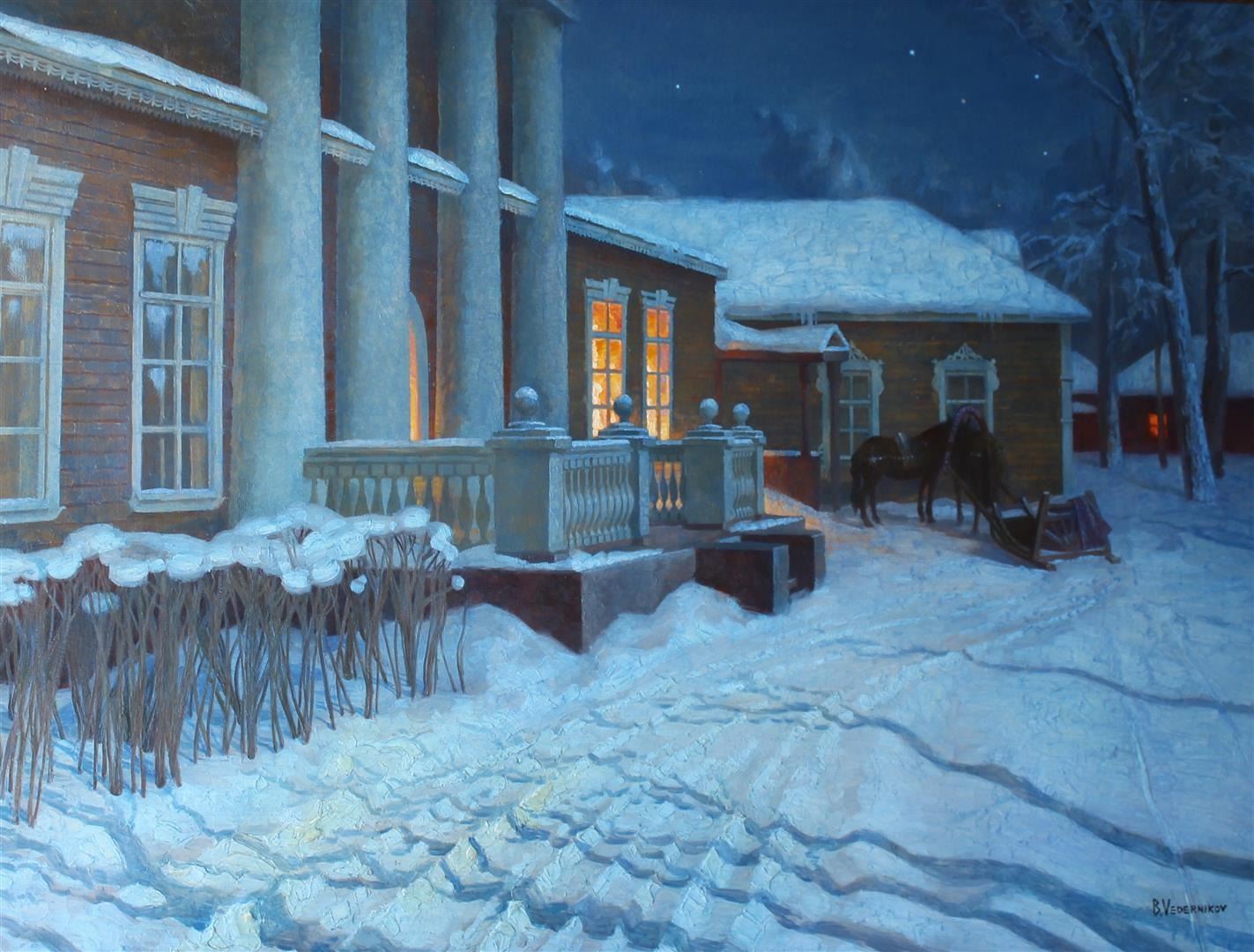 Under a starry, winter night sky, two horses with a sled stand outside the dimly-lit windows of a house in Boris Vedernikov's oil on canvas. The painting measures 26 x 38; framed image measures approx. 38 x 50.