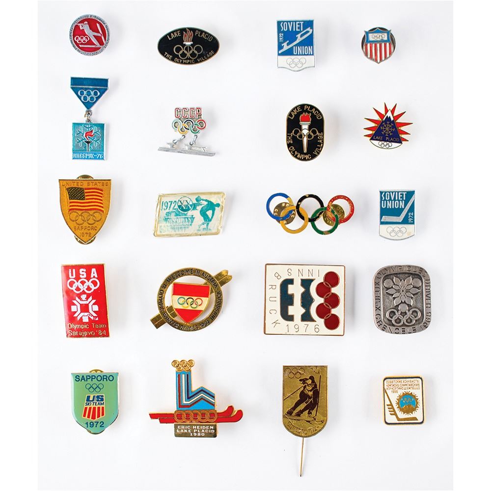 Collection of nearly 130 logo and souvenir pins from past Winter Olympics, ranging in size from 6 mm x 6 mm to 51 mm x 38 mm, which includes sundry pins for Olympiads held in Cortina (1956), Squaw Valley (1960), Innsbruck (1964), Grenoble (1968), Sapporo (1972), Innsbruck (1976), Lake Placid (1980), and Sarajevo (1984). In overall fine condition.