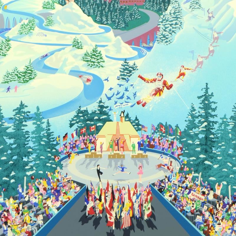 "Winter Olympics Games" is a limited edition serigraph on paper by Melanie Taylor Kent, numbered and hand signed by the artist. Includes Letter of Authenticity. Measures approx. 28" x 39" (with border), 22" x 31" (image).