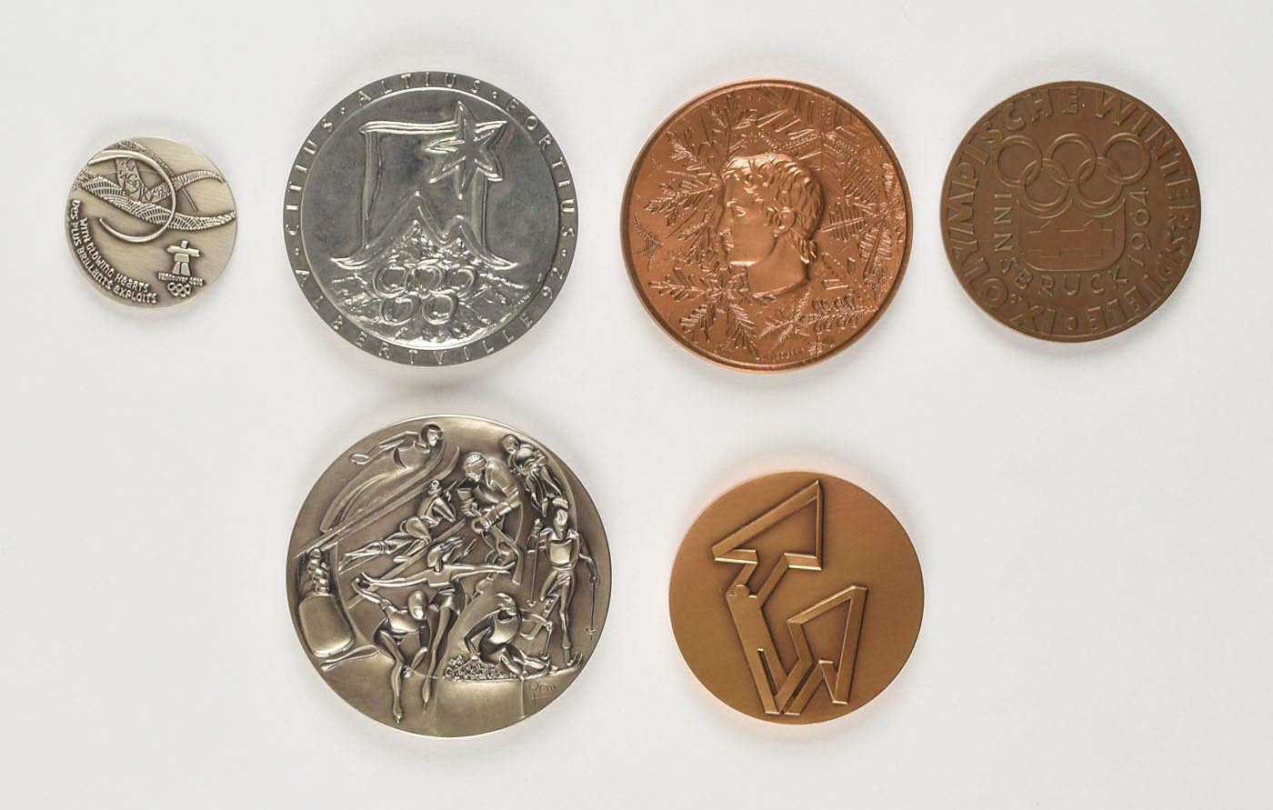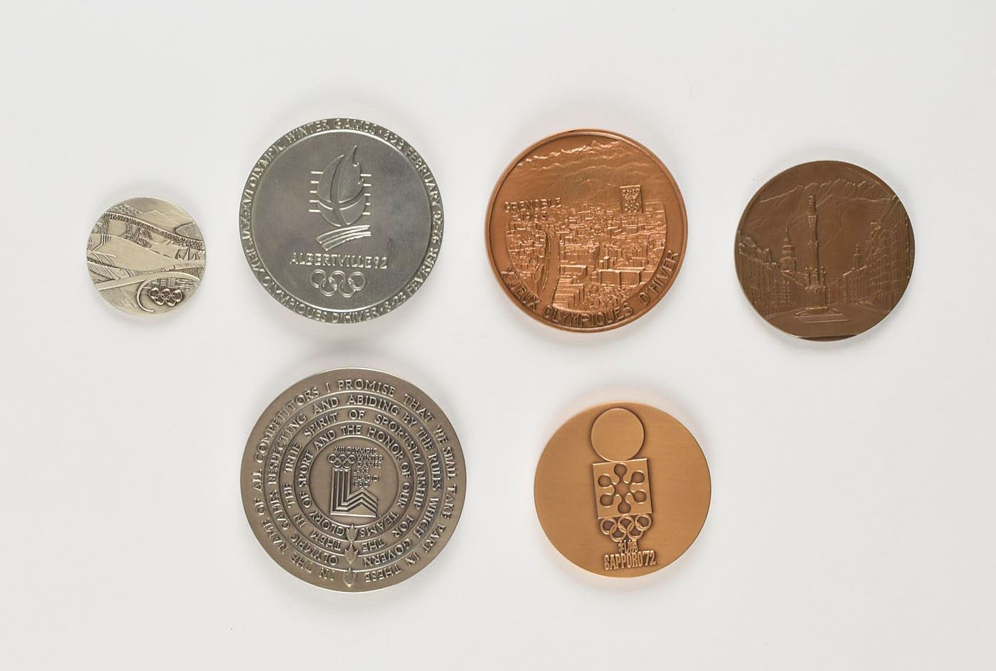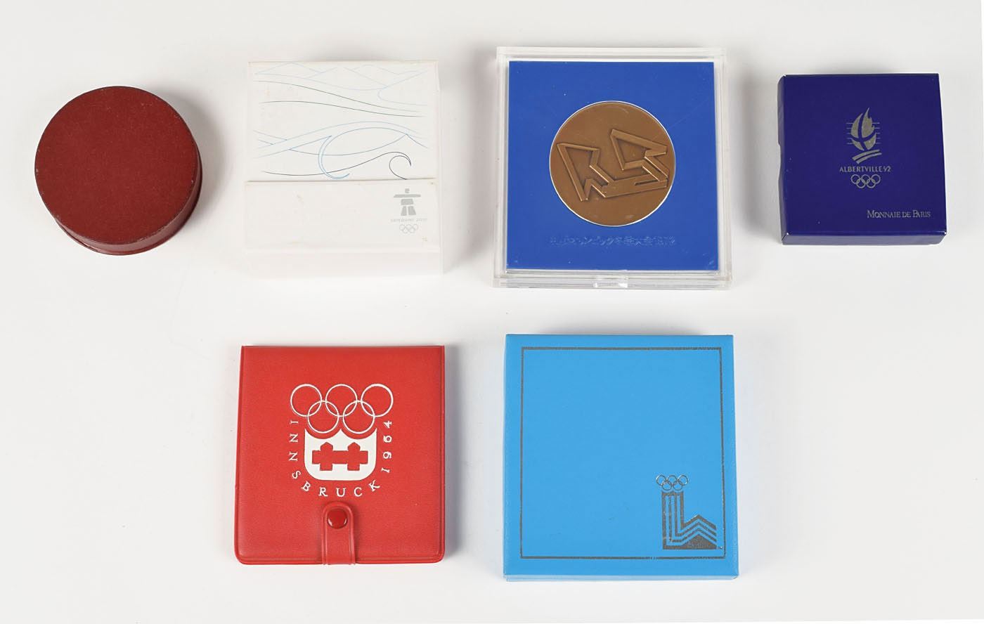 Desirable grouping of six Winter Olympics participation medals, with each including their original presentation box or case. The medals include: Innsbruck 1964 Winter Olympics Bronze Participation Medal; Grenoble 1968 Winter Olympics Bronze Participation Medal; Sapporo 1972 Winter Olympics Bronze Participation Medal; Lake Placid 1980 Winter Olympics Nickel-Silver Participation Medal; Albertville 1992 Winter Chrome-Plated Steel Olympics Participation Medal; and Vancouver 2010 Winter Olympics Pewter Volunteer Participation Medal. An appealing sextet of Olympic medals, each bearing striking original designs relating to the host country.