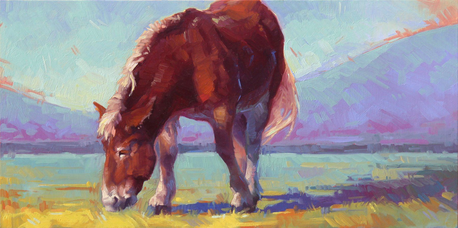 Artist: Whitney Hall. Title: Winter Pasture. Artwork size: 12" x 24". Frame: 16" x 28". Medium: Oil on Panel. Artist's description: I couldn't resist this peaceful mule, grazing with a group of his fellow draft mixes in a pasture high up in the foothills. The season was just starting to turn toward spring and the new grass was blushing green as the snow receded.