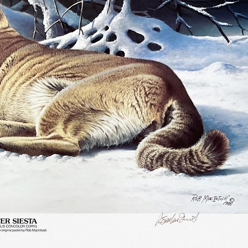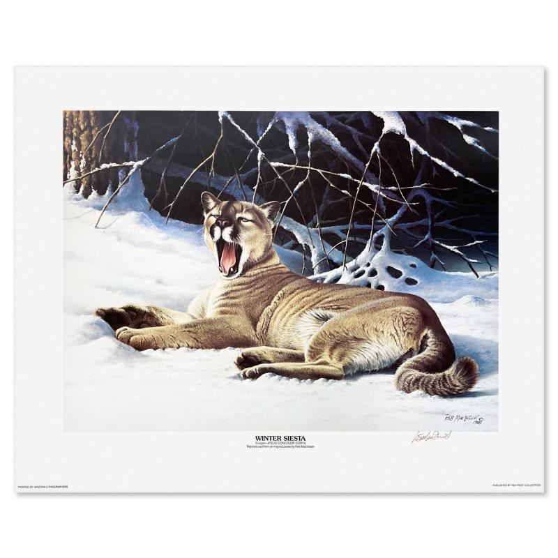 "Winter Siesta" is a limited edition lithograph on paper by Rob MacIntosh, numbered Elephant Territory and hand signed by the artist. Includes Letter of Authenticity. Measures approx. 23" x 28" (border), 17" x 22" (image). Due to the thin nature of the paper there are minor creases on the paper.