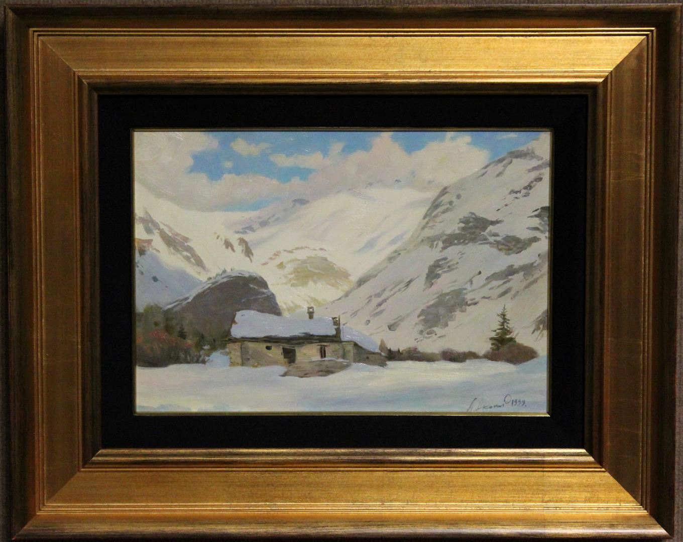 A lone, rustic house, portrayed by artist Alexander Akopov, braves the winter, sitting at the foothills of a snow-covered mountain range. The oil on canvas measures 9.5 x 13.625; framed painting measures approx. 21.5 x 25.625.