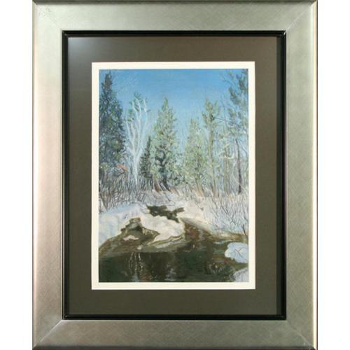 ?Winter Stream?, done by the talented R. Brown, is a wonderfully original pastel drawing depicting exactly just that, a stream in the season of winter. The cool hues of green, blues, and grays create a chilly atmosphere that personifies winter. The beautiful blue sky isn?t marred by any sort of cloud cover that one might expect on a cold winters day, instead it exudes a brightness that one would find on a sunny day. The brilliance of the white snow draws the viewer into the intricate, entwining branches of the underbrush and the tall trees further back. With its glassy surface of dark depth, the tranquil stream flows lazily back into the picture with its icy reflections rippling by. The pastels have created a soft and velvety texture that is a visual feast for the eyes. It has been double matted with a pristine white bottom mat that really sets of the fresh snow and a top black mat that highlights the shadows and creates a nice contrast with the white. The sleek silver wood frame, with its black inner liner, adds a more contemporary feel to the drawing and makes the piece measure 18 ¼? x 22 ¼?. In addition, the artist has signed the work in the lower right hand corner. This is a lovely piece that is truly an exceptional value.