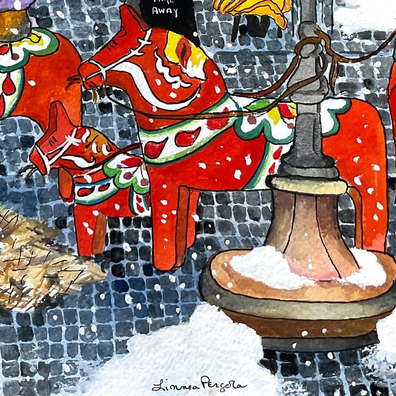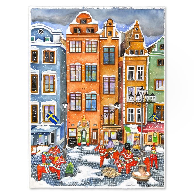 "Winter in Stockholm" is an original painting, watercolor on paper, by Linnea Pergola. The piece is hand signed by the artist and comes with a letter of authenticity. Measures approximately 30" x 22".