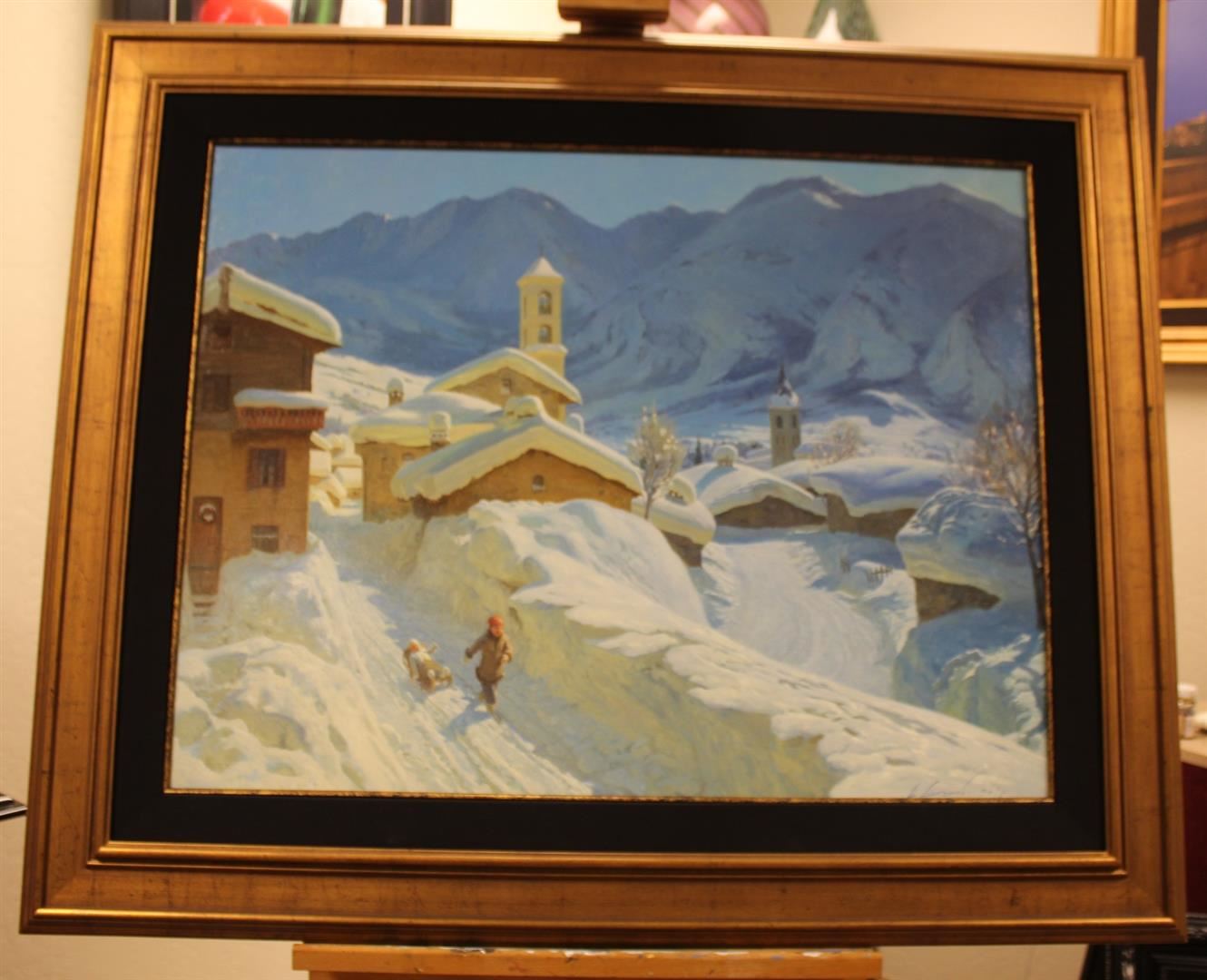 Winter in the Alps by Alexander Akopov is a framed original oil on linen showing a child and his dog on a walk in a beautiful snowy scenery. The sizeing is 37 1/2" and 45 1/2" framed.