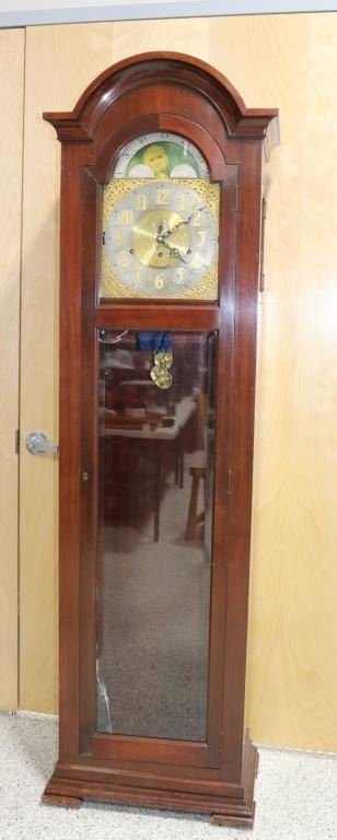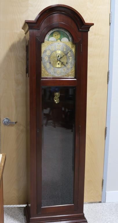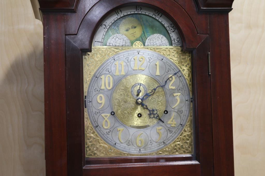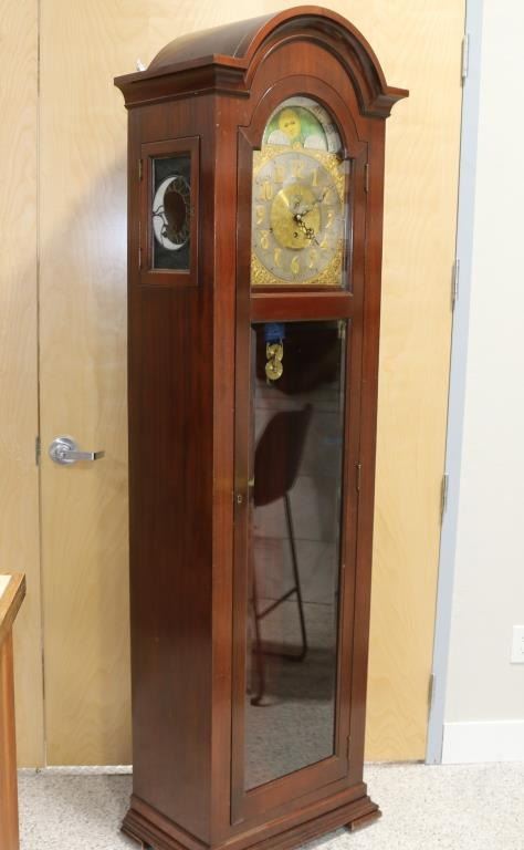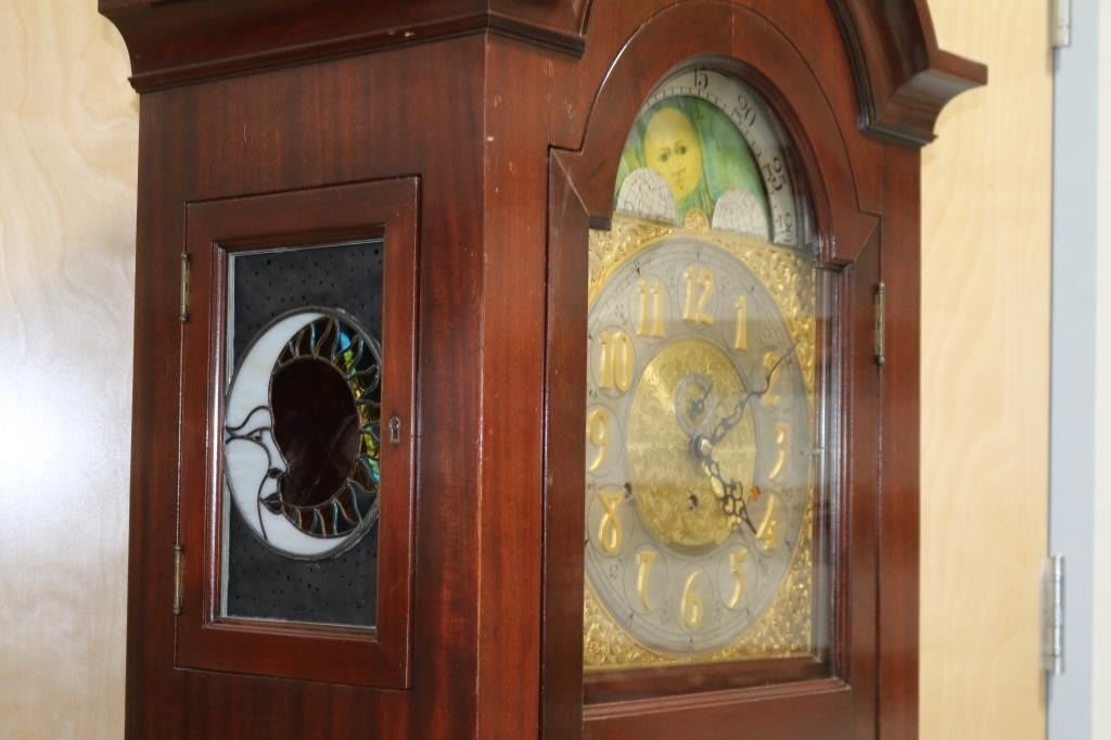 or may be Elliot of London,Unmarked, Fancy brass face, mahogany case. Left and right sides have stained glass moon and sun. Glass doors, day and night indicator at top archway. 86" tall, 26" wide, 14" deep.