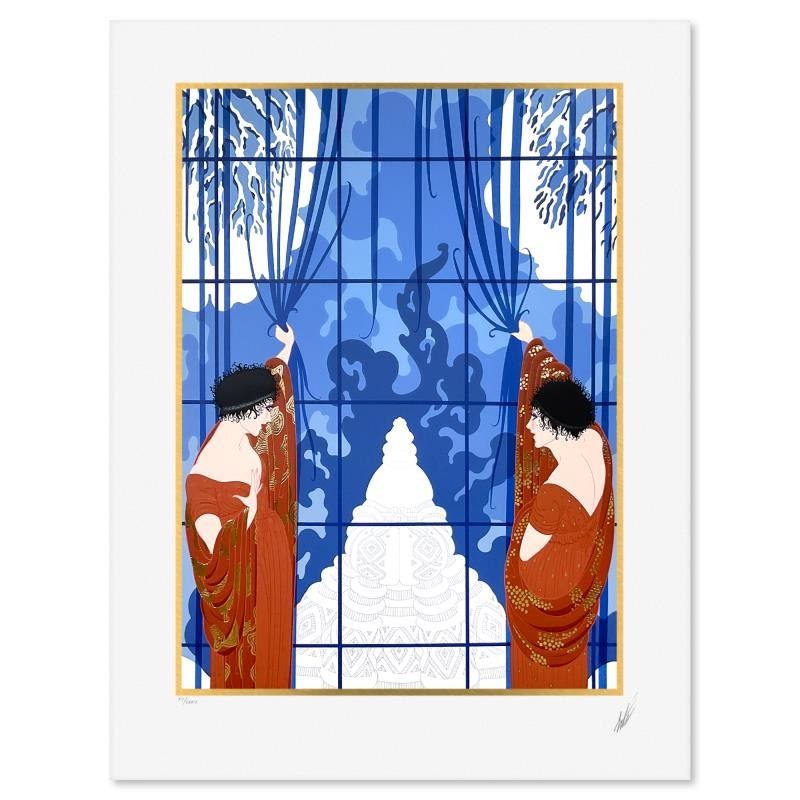 "Winters Arrival" is a limited edition serigraph on paper by Erte (1892-1990), numbered XII/CXXV and hand signed by the artist. Includes Letter of Authenticity. Measures approx. 33" x 24.5" (border), 26" x 19" (image). There is a very small hairline crack on the bottom-right part of the image that is only noticeable upon very close inspection.