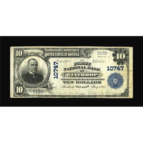 <B>Winthrop, NY</B></I> - $10 1902 Plain Back Fr. 632 <B>The First NB</B></I> Ch. # 10747<BR> A tough bank in large size, with only $840 outstanding in 1935. Nice <B>Fine-Very Fine,</B></I> ex-CAA's January, 1995 Orlando sale, lot 2214. <BR><I>From The Thomas A. Bergin Collection</B></I><BR><BR><b>Shipping:</b> Coins & Currency (<a target="_blank" href="http://www.heritageauctions.com/common/shipping.php">view shipping information</a>)