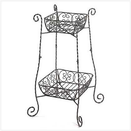 Wire Basket Plant Stand **|**|** Graceful wrought-iron curlicues combine to create a fetching stand for your favorite plants; two-tiered design makes a handsome space-saving display! Metal and wire. Some Assembly Required. 15 1/2" square x 27 1/2" high.