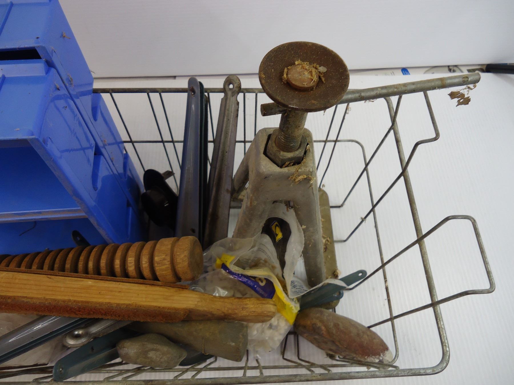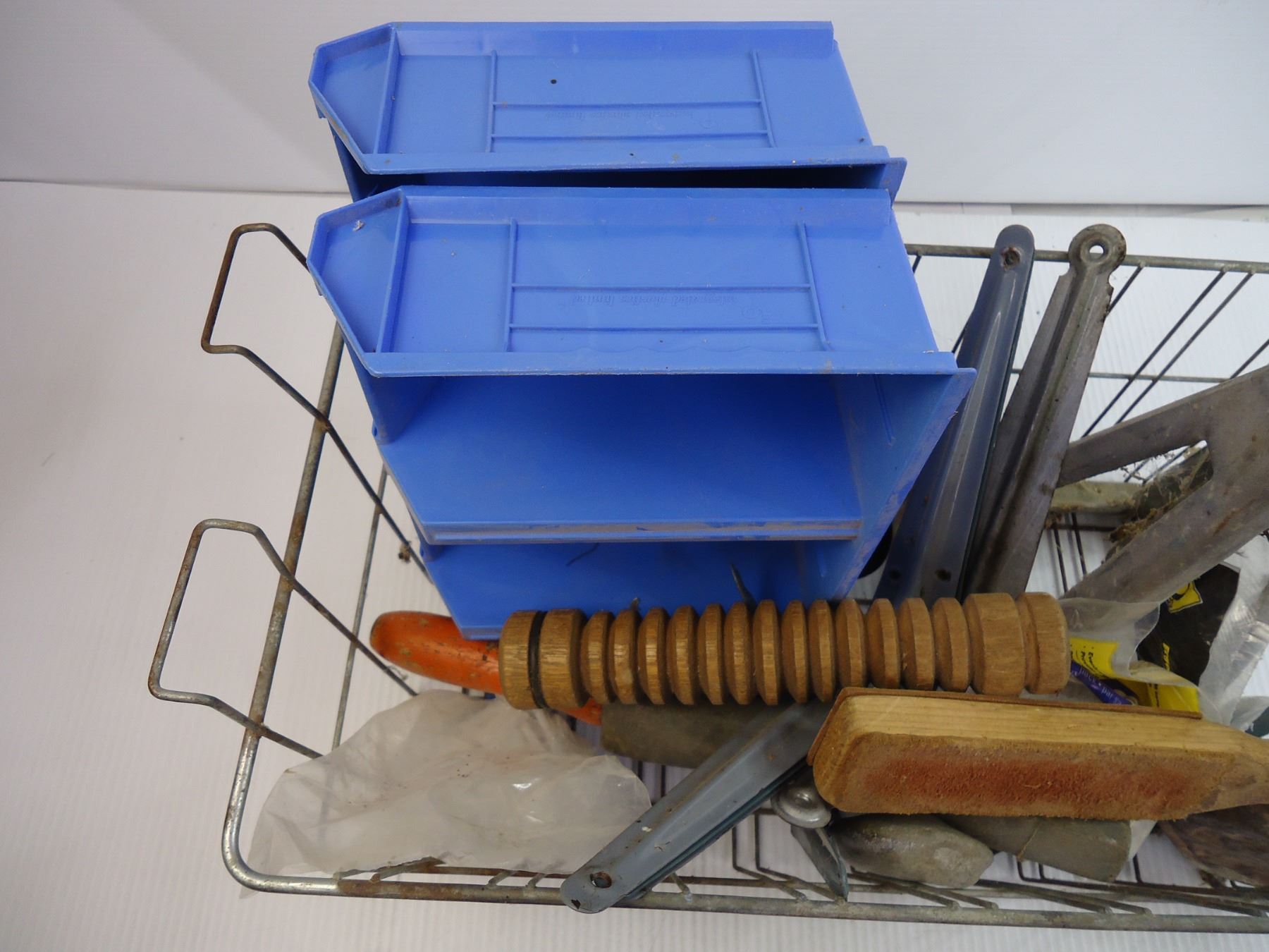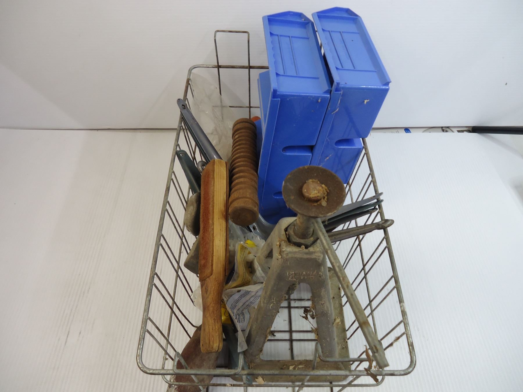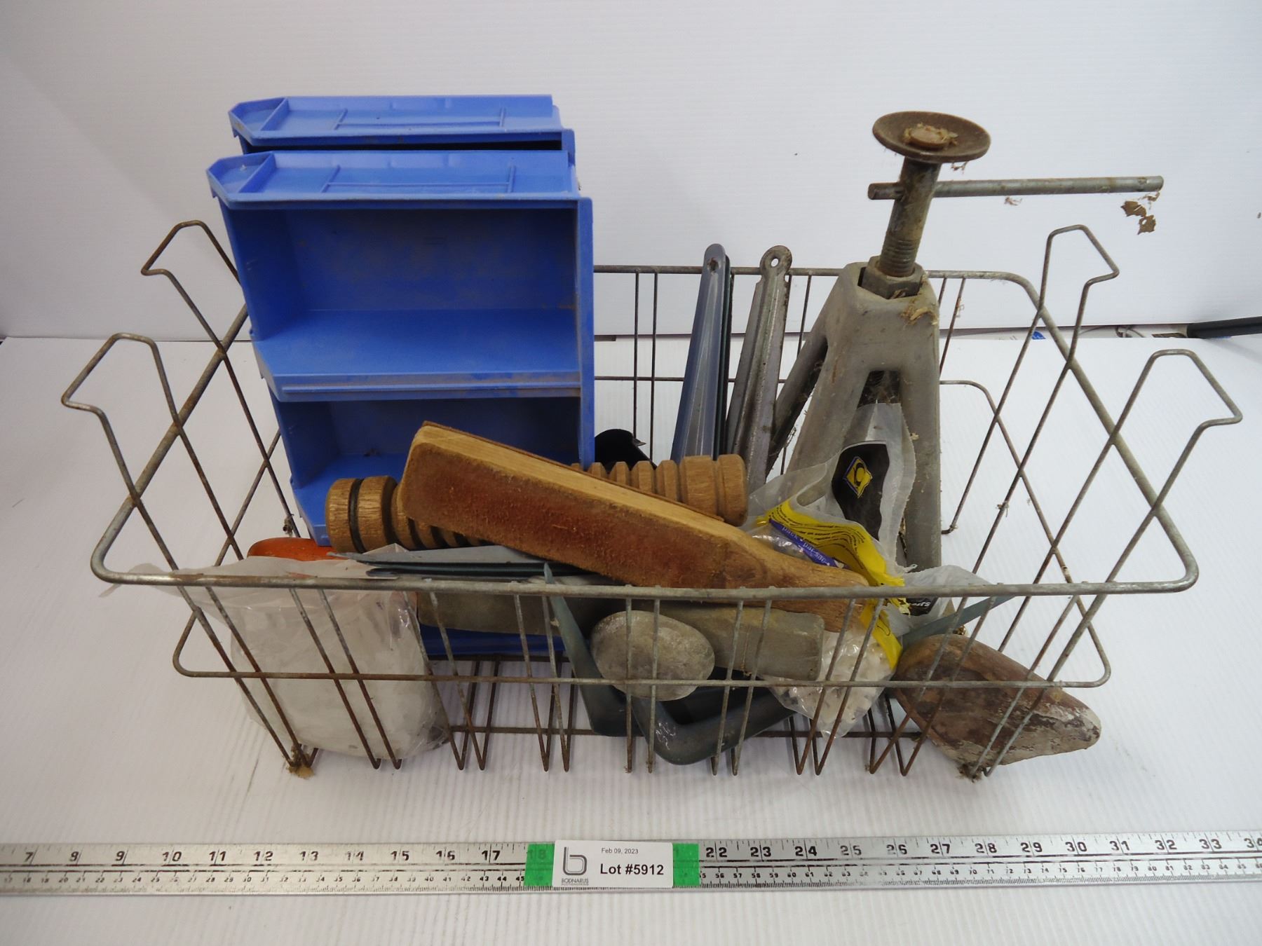 Wire Basket with Trailer Jack,Shelf Brackets,Knife Sharpener and misc. items