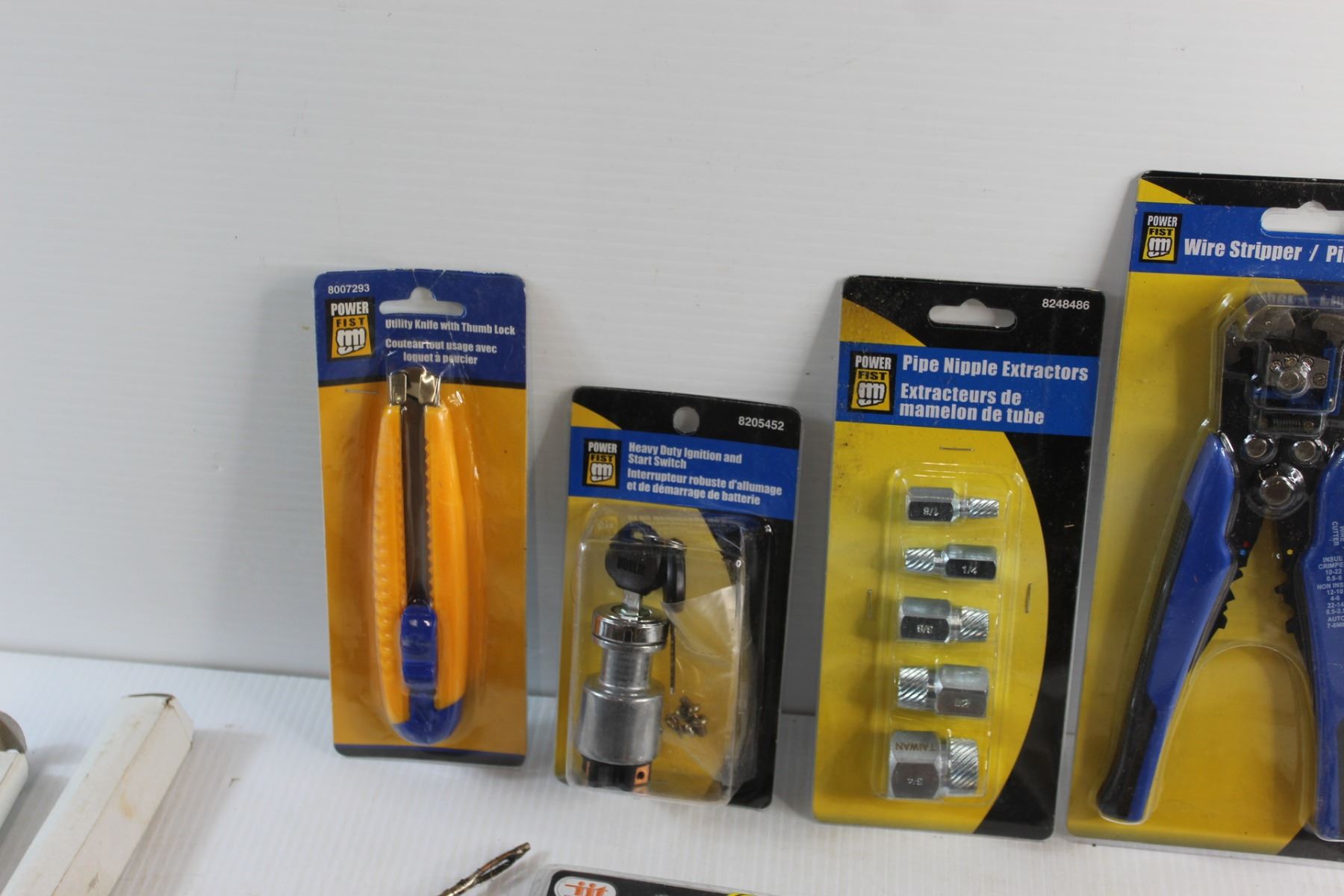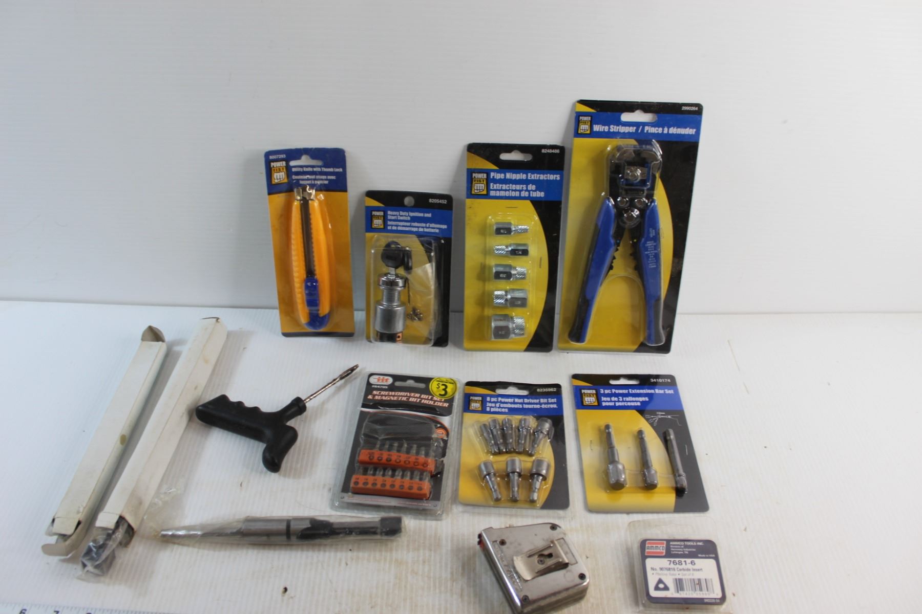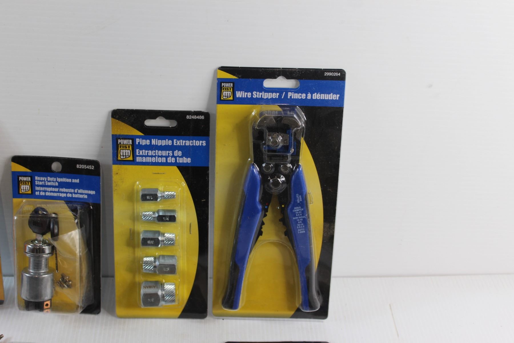 Wire Stripper, Pipe Nipple Extractors, Heavy Duty Ignition and Start Switch, Tape Measure and Assorted Items