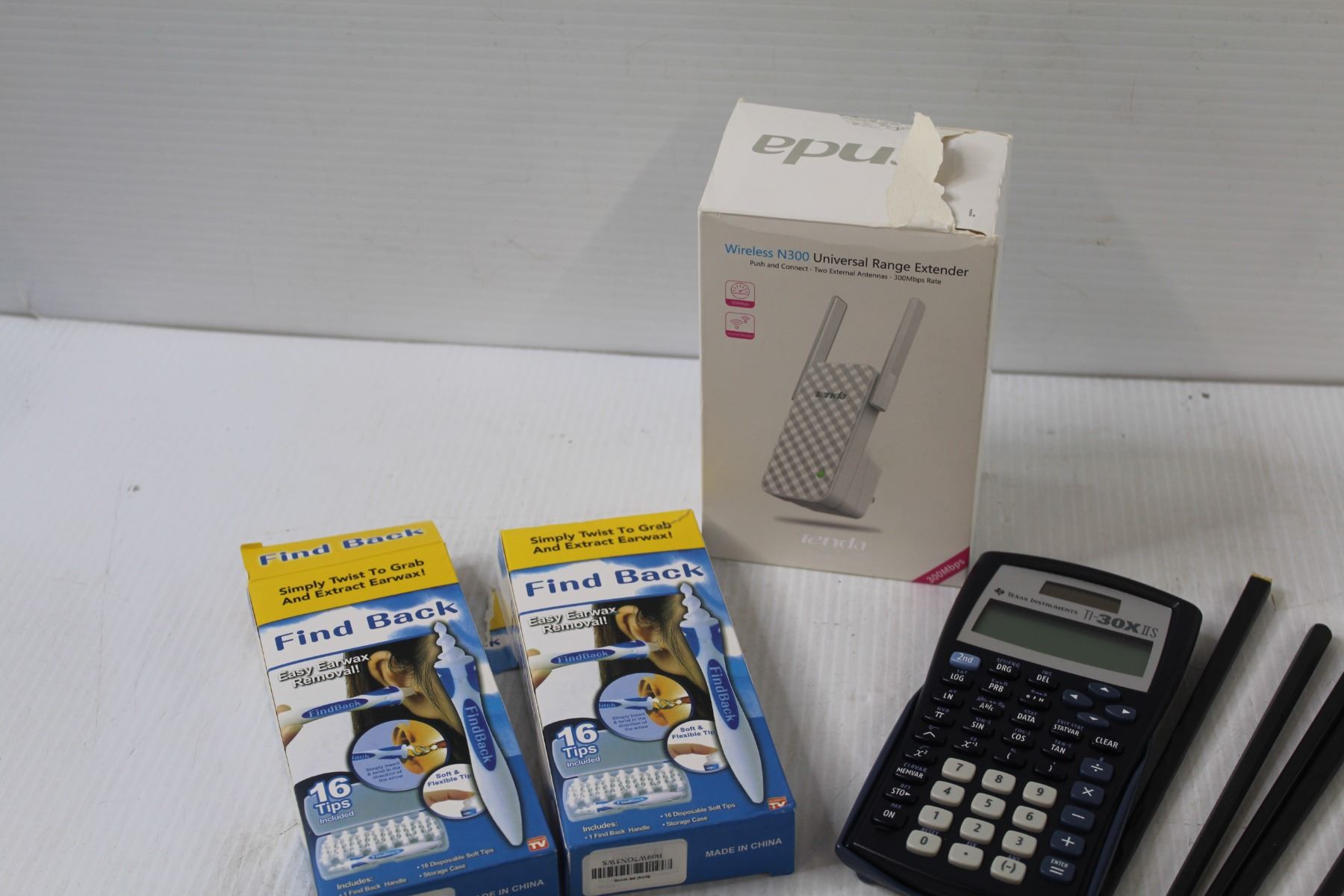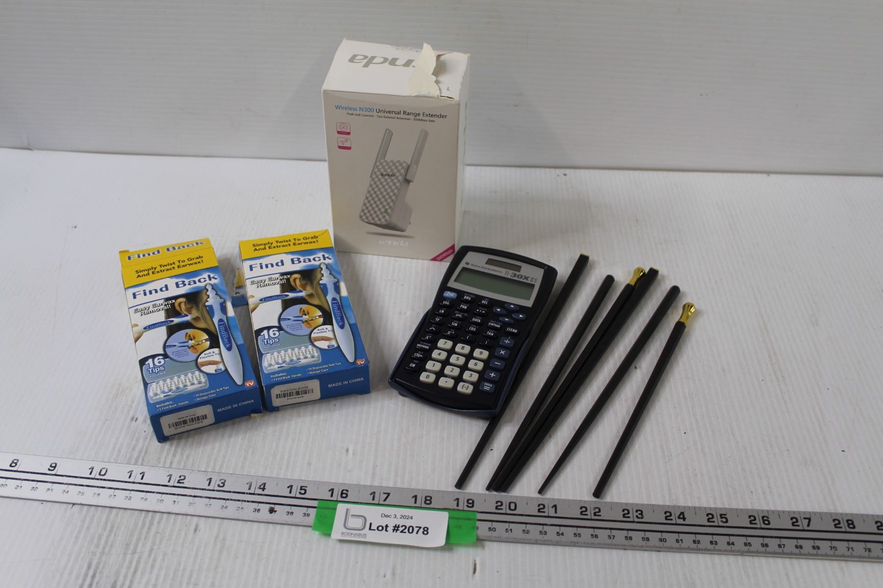 Wireless N300 WiFi Range Extender & Texas Instrument Calculator, (2) Ear Wax Kits, Chop Sticks Set (Some Wear)