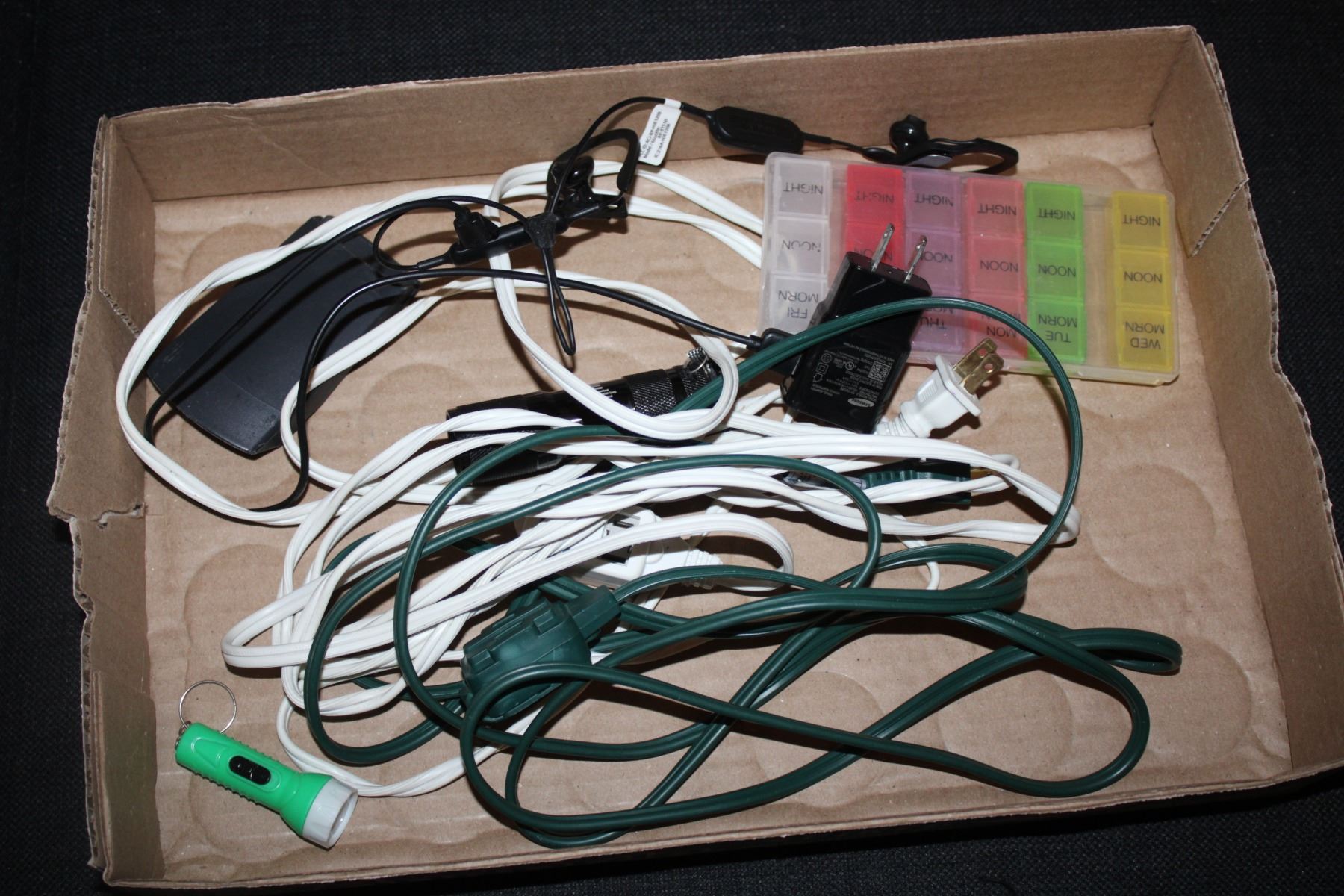 Wireless headphones, power bar/cords, misc items