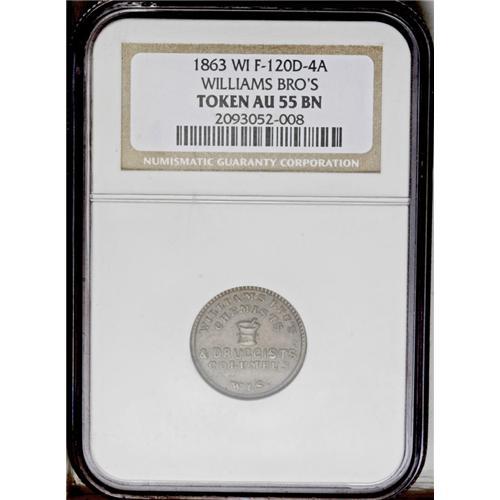 <B>1863 Williams Bro's, Fuld-WI-120D-4a, R.8, Columbus, WI, AU55 NGC.</B></I> Williams Bros were chemists and druggists. This R.8 token shows a mortar and pestle.<BR><I>From The Troy Wiseman Collection.</B></I>