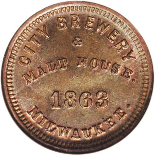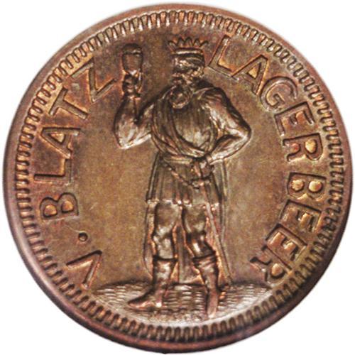 <B>1863 V. Blatz Lagerbeer, Fuld-WI-510E-1a, R.2, Wisconsin, MS65 NGC.</B></I> This issue for Blatz beer shows a figure of Gambrinous on the obverse. A lustrous Gem example of this R.2 token, seldom seen in MS65.<BR><I>From The Troy Wiseman Collection.</B></I>