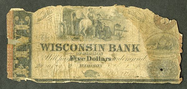 Madison, Wisconsin. $5, Issued, WI-45-Unlisted. Unlisted in Haxby. Black with no under print, Men and boy with horses in middle, seal at right, Almost Good to Good with missing top right corner and parts of the top left border, still extremely rare and possibly impossible to find. WHW.