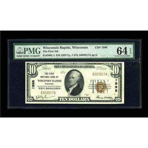 <B>Wisconsin Rapids, WI</B></I> - $10 1929 Ty. 1 <B>The First NB</B></I> Ch. # 1998<BR>This second title example looks as original as the day it was made. Encapsulation in the grade of <B>Choice Uncirculated 64 EPQ</B></I> courtesy of PMG.<BR><BR><b>Shipping:</b> Coins & Currency (<a target="_blank" href="http://www.heritageauctions.com/common/shipping.php">view shipping information</a>)