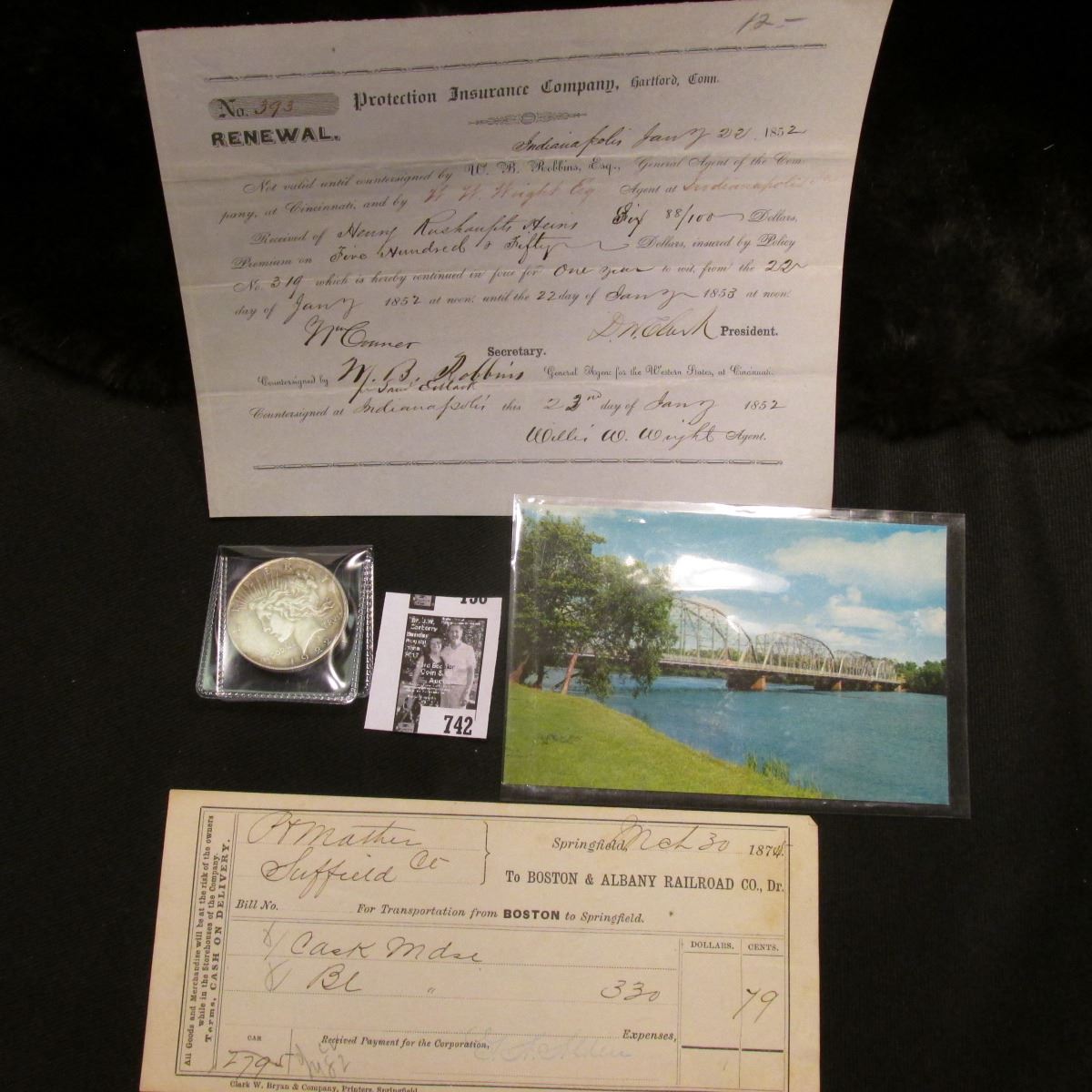 "Wisconsin River" Post card; 1875 Invoice "To Boston & Albany Railroad Co."; 1852 "Protection Insurance Company, hartford, Conn." Renewal receipt; & 1922 P U.S. Peace Silver Dollar, VG.