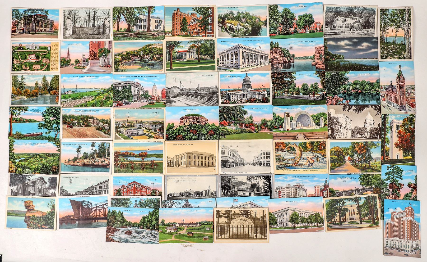 Lot of 50 +. Wht. border and borderless. Mostly linen era, few by Curteich & Co.. Postmarks i.e; Fort Atkinson , No. Chicago Ill., Poynette Wis., Rice Lake, Erie PA., West Bend. Street Level View i.e.; Black Hawk War Memorial , colleges, public bldg's, Paul Bunyan's Home Camp, lakes/rivers, street scene Milwaukee '40s era,. Castle Rock Sparta Wa., street scene Main St. Kenosha Wi.,circa 1920's, Largest Single Bascule Lift in the World Green Bay. Birdseye i.e. ;Old For Winnebago Portage Wi. Wisconsin 1930-44 Ken Prag Collection