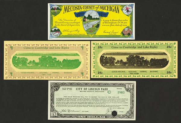 Lot of 4 notes, Includes Michigan, City of Lincoln Park and Mecosta County of Michigan notes and Cambridge, Wisconsin, Chamber of Commerce notes. AU to CU.