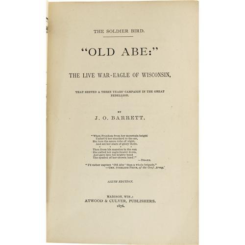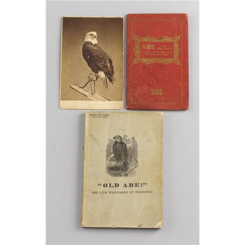 <B>Wisconsin's Civil War Eagle Grouping.</B></I> Company "C" of the hard-fighting 8th Wisconsin Infantry adopted an eagle fledgling at the beginning of the Civil War. Appropriately named "Old Abe", their mascot had a portable roost that accompanied the regimental color guard. Theirs was indeed a "war eagle" as it flew above the troops during thirty-six engagements over a three-year period. "Old Abe" retired to the Wisconsin State Capitol in September, 1864 and lived until 1881. This lot of memorabilia reflects the celebrity and hero's status enjoyed by the feathered veteran. Included are the following items: Cabinet card, "The Centennial Photograph of 'Old Abe', the Live Wisconsin War Eagle". Abe, looking every inch the American warrior, sits upon his roost in this image sold at the Centennial Exposition in 1876. Some stains and pencil notations on verso, small water stain and minor chipping on front; Booklet, "<I>Old Abe!" The Live War-Eagle of Wisconsin</B></I>", by J.O Barrett (Madison, Atwood & Culver, 1876), sixth edition, 128 pages, 12 mo, paper wrap on front. This publication was sold with the cabinet card image. Cover soiled, first few pages creased. Good condition overall; Booklet, "<I>Abe the War Eagle</B></I>", (Lynn, Massachusetts, C. P. Nelson, 1903), 32 pages, 16mo, red card wraps. Dedicated to veterans, this booklet has two fine plates showing Abe in action. Light wear to cover, else fine condition.<BR><BR><b>Shipping:</b> Small Collectibles (<a target="_blank" href="http://www.heritageauctions.com/common/shipping.php">view shipping information</a>)