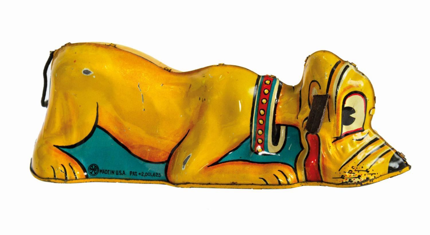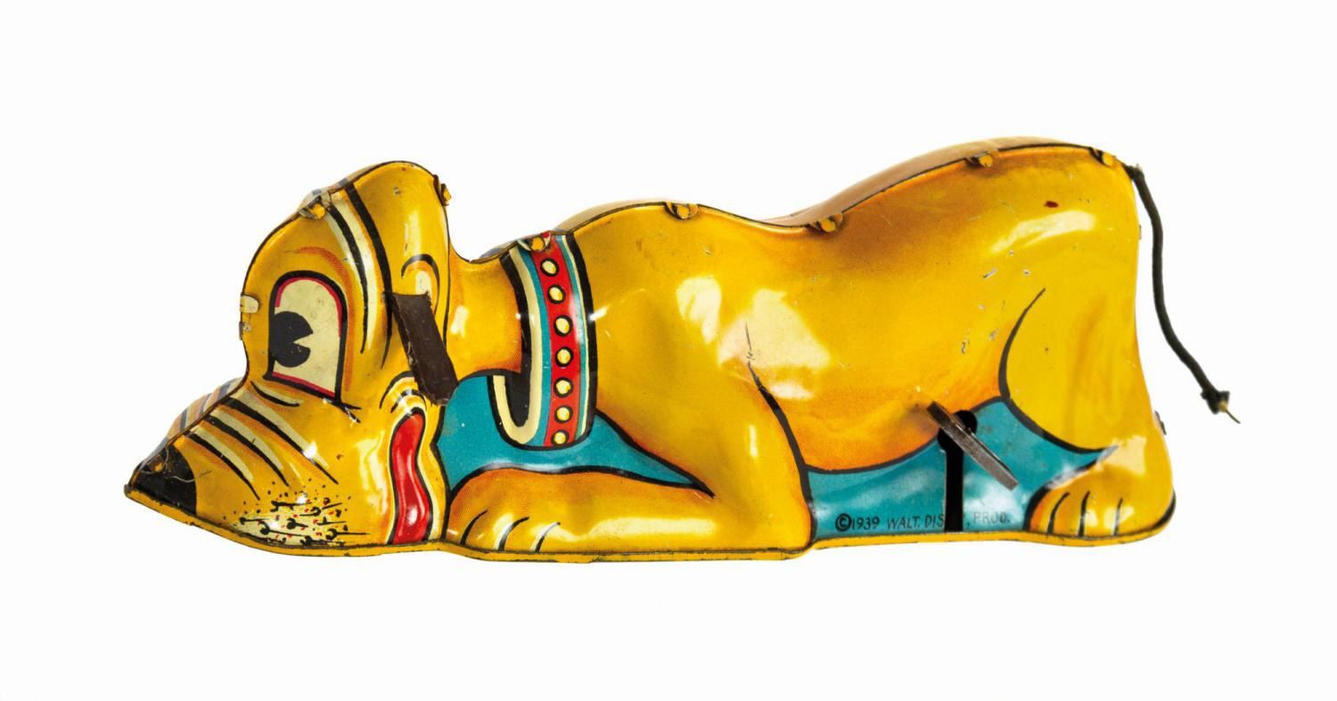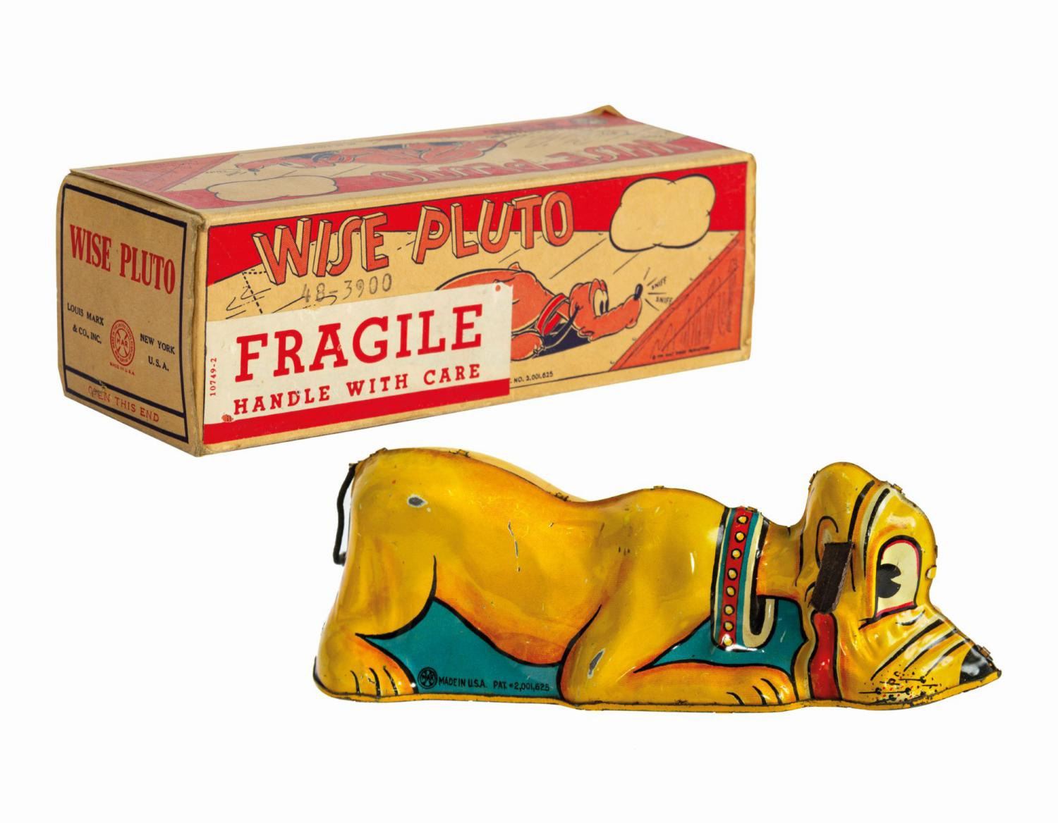 (Louis Marx, 1939) A vintage tin lithographic Wise Pluto wind-up toy manufactured by Louis Marx & Co. When the integral key in the side of the figure is wound, three wheels in the base turn, causing Pluto to roll in a winding fashion. The mechanicals are in working order, however, a chunk of rubber is missing from one of the rear wheels, which prevents Pluto from moving fluidly. The toy retains its original cardboard box packaging. The box measures 3"x8.25" and 3" deep and is in good condition. An interior flap and a portion of the outer side flap are missing, and a vintage "Fragile" sticker is adhered to a side panel. Measuring 2.5" tall, 8" long, and 2.75" wide, the toy is in very good condition with some surface scratches and chips.