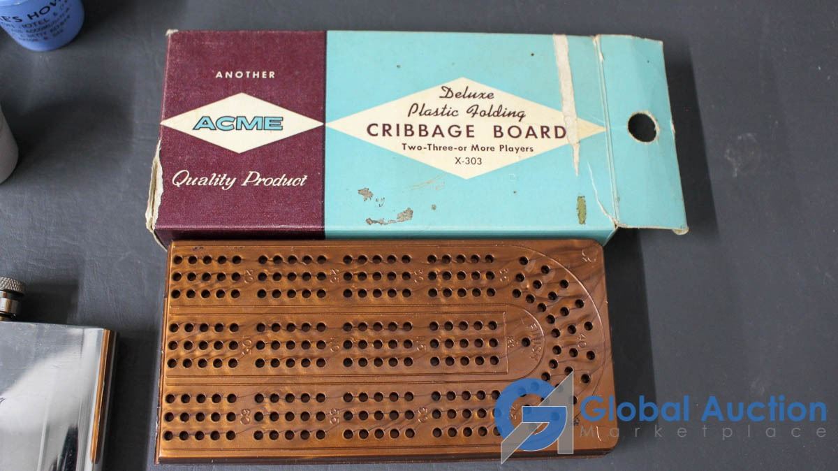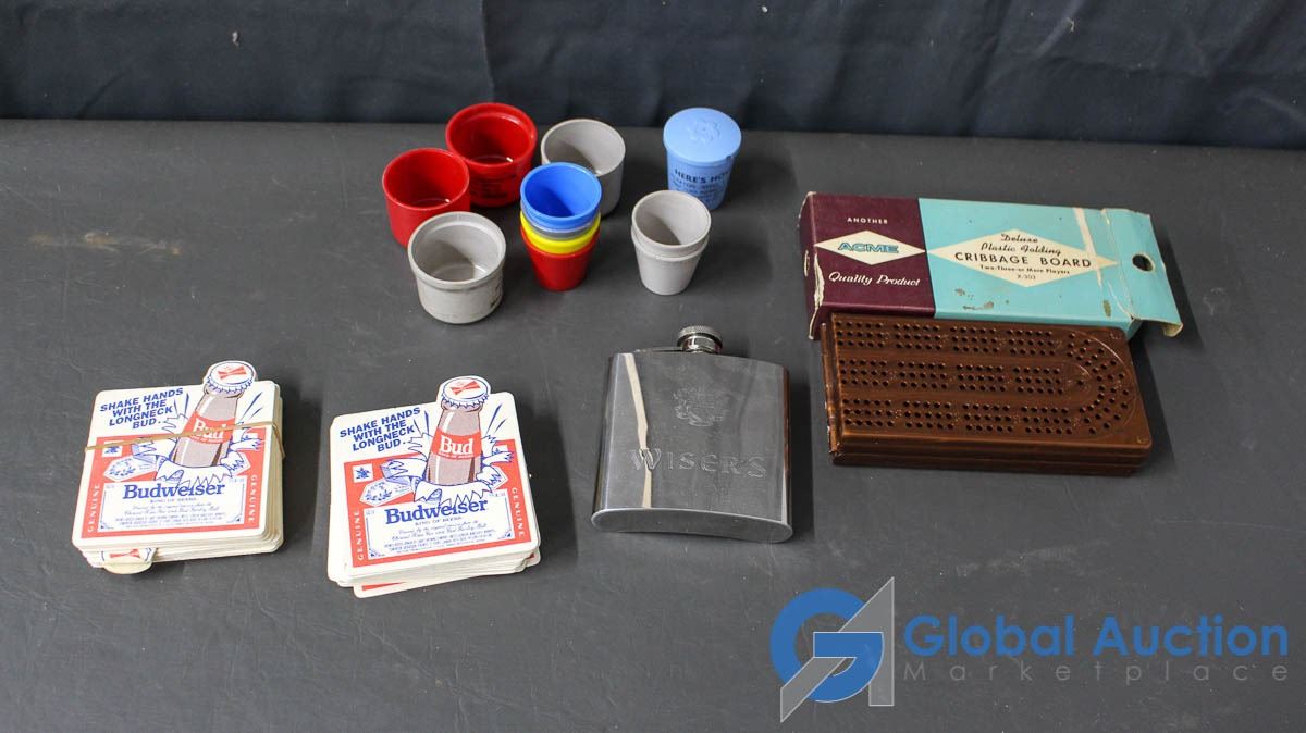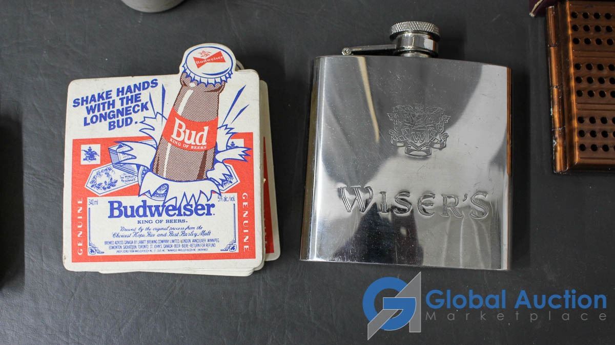 Wisers Flask, Budwiser Coasters, Plastic Shot Glasses, Vintage Cribbage Board