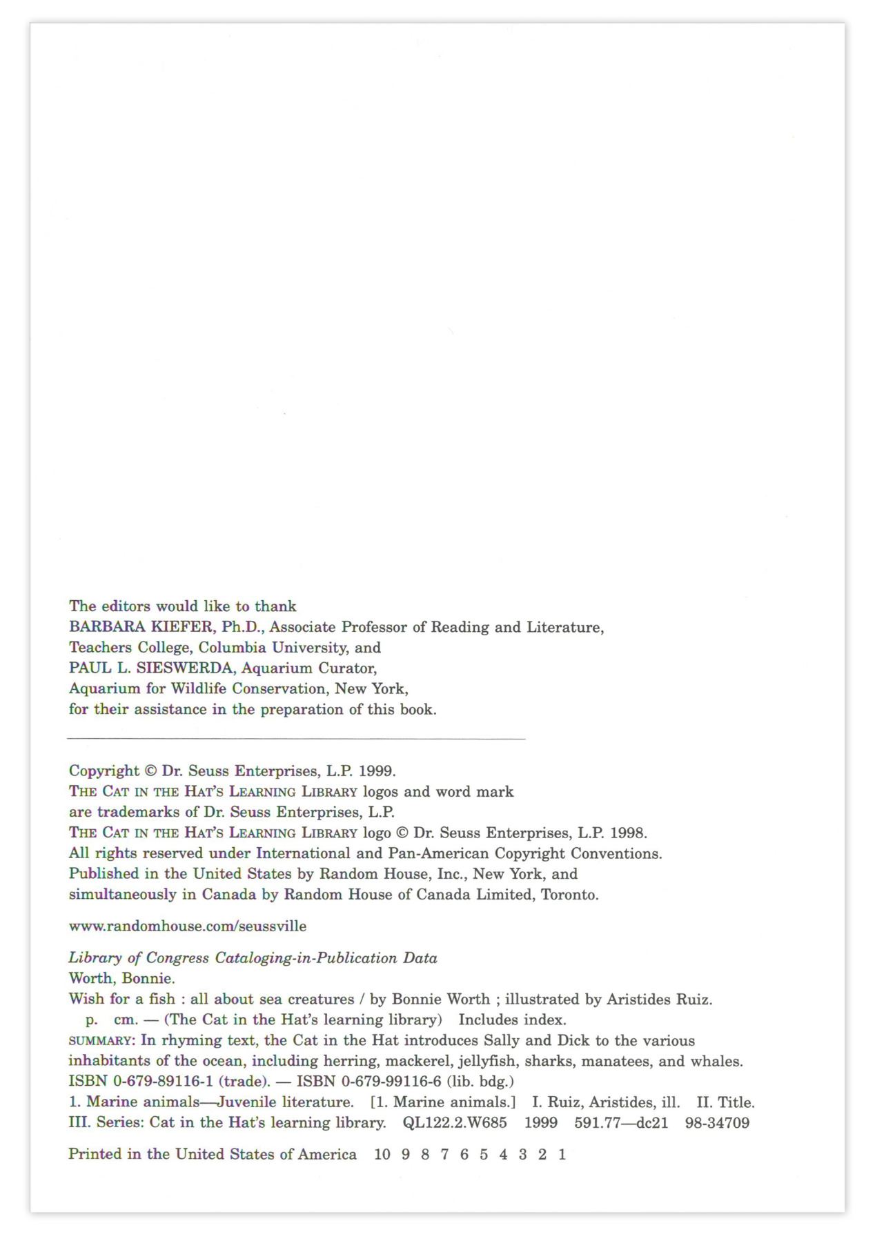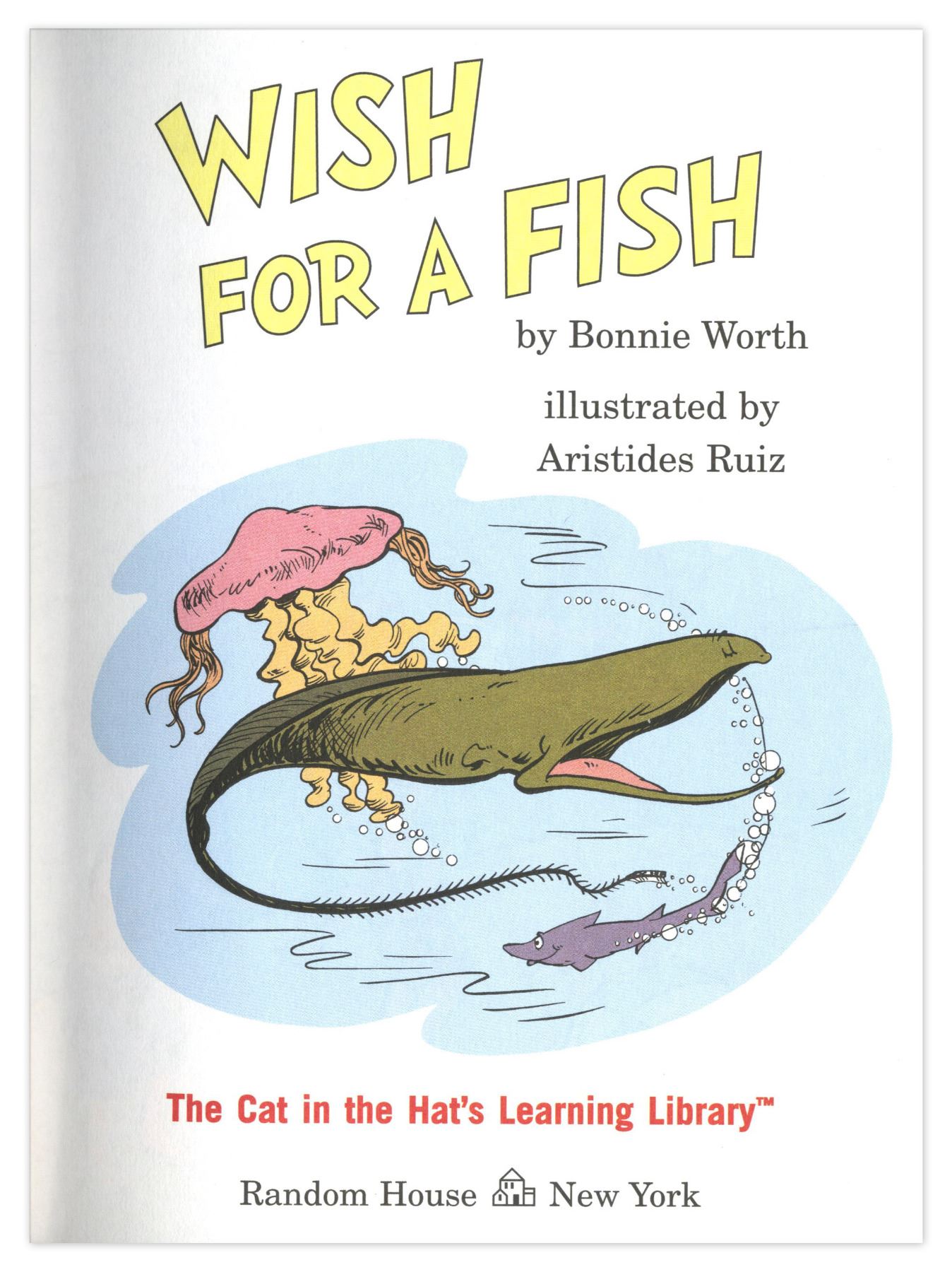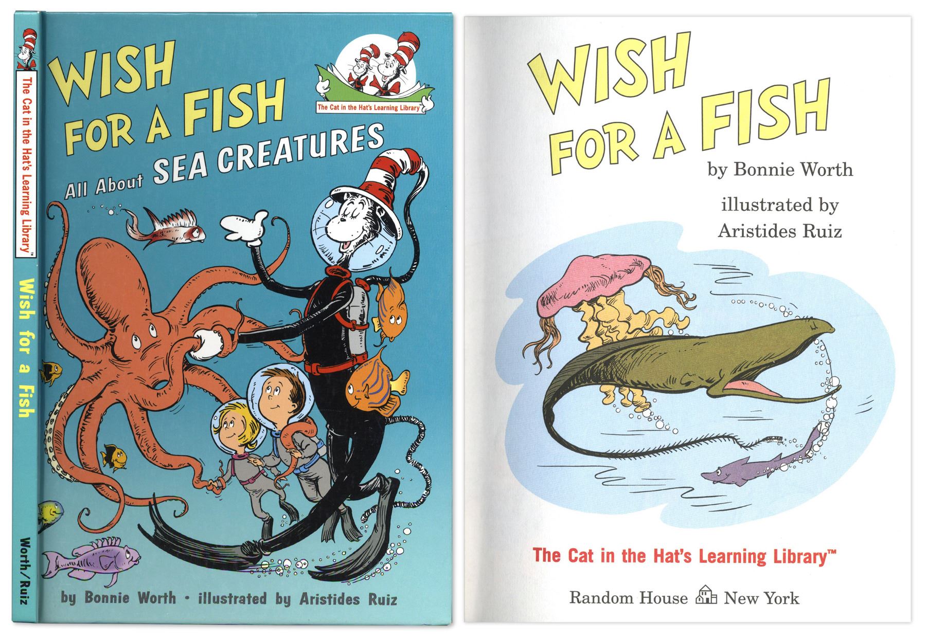 First edition, first printing of ''Wish For A Fish All About Sea Creatures'', written by Bonnie Worth and illustrated by Aristides Ruiz. Random House: New York: 1999. Though not written or illustrated by Dr. Seuss, the book features his famed Cat in the Hat character, who narrates this fact-filled story of life under the sea aboard the S.S. Undersea Glubber, along with sidekicks Thing One and Thing Two. Issued without a dust jacket, book measures 6.75'' x 9.25'', in fine condition.