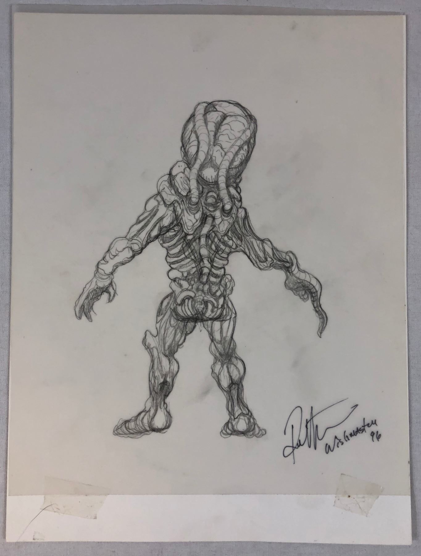 Original hand drawn concept artworks of the evil djinn baby, who was played by Verne Troyer (Of Mini-Me fame). Signed and dated by Robert Kurtzman. Measuring 12 x 9 drawn with pencil on velum over paper. From the production of Wishmaster (1997), the horror movie where, a demonic djinn attempts to grant its owner three wishes, which will allow him to summon his brethren to Earth.