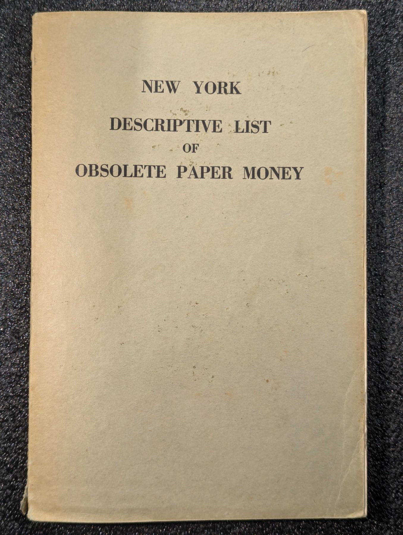 Wismer, David C. NEW YORK DESCRIPTIVE LIST OF OBSOLETE PAPER MONEY. J.W. Stowell Printing Company, Federalsburg. 1931. 12mo. (8), 196, (18) pages. original printed card covers. B&w currency photos throughout. English text. lower spine worn and chipped, covers sun-faded, Very Good. This book is a descriptive listing to the obsolete notes used in the state of New York. It lists the notes by catalog number organized by issuing entities and then by denomination. Each note description includes descriptive information and an image where possible. Lot weight: 1 lbs 0oz. Subject(s): United States Paper Money.