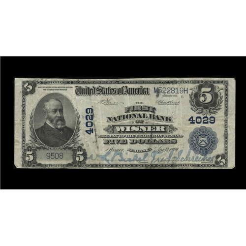 <B>Wisner, NE</B></I> - $5 1902 Plain Back Fr. 600 <B>The First NB</B></I> Ch. # 4029<BR>This was the first of the two Federally chartered banks located here to receive its governing document. This example is amply margined all around and overall grades <B>Very Fine.</B></I>