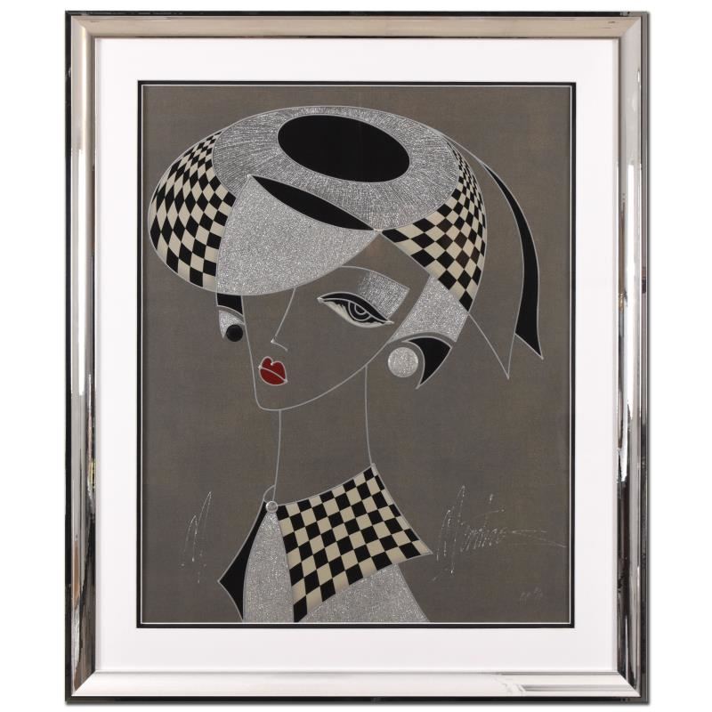"Wistful Elegance" is a limited edition mixed media silkscreen on paper by Martiros Manoukian, PP numbered 3/3 and hand signed by the artist. This piece comes custom framed with a mirror-like finish. Includes Letter of Authenticity. Measures approx. 31.5" x 37.5" (frame), 23" x 29" (image).