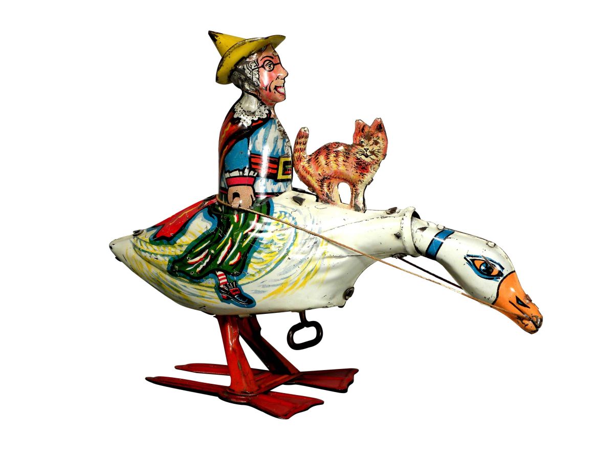 Witch Riding Goose w/Cat Tin Wind Up Toy. A few minor scratches mostly to cats face otherwise very good working condition. 7 1/2 inches tall X 8 inches long.