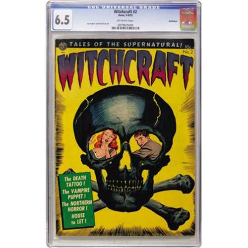 <B>Witchcraft #2 Bethlehem pedigree (Avon, 1952) CGC FN+ 6.5 Off-white pages.</B></I> Skull cover. Joe Kubert art. Overstreet 2007 FN 6.0 value = $156; VF 8.0 value = $317. CGC census 6/07: 1 in 6.5, 2 higher.<BR><BR><b>Shipping:</b> Comics - Slabbed (certified) (<a target="_blank" href="http://www.heritageauctions.com/common/shipping.php">view shipping information</a>)
